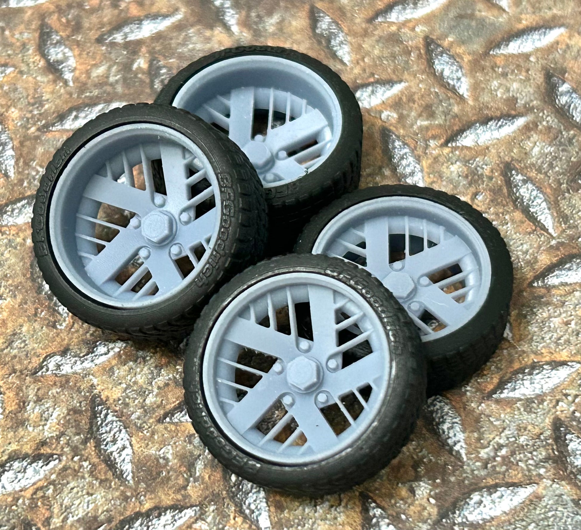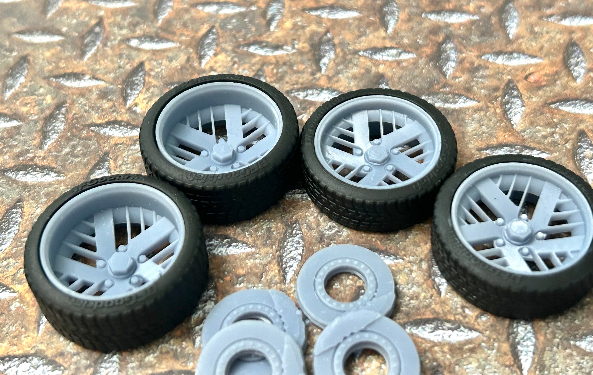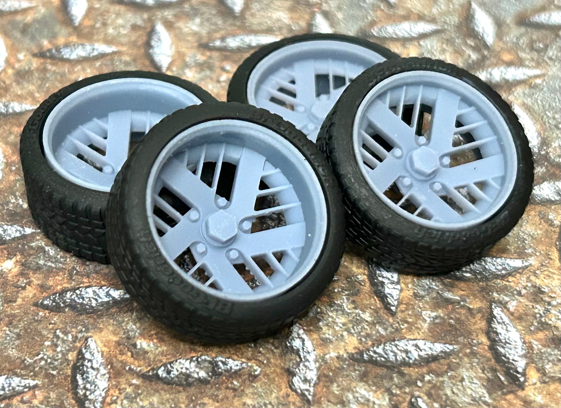 Resin wheels and tires for a 1/24 or 1/25 scale model car.