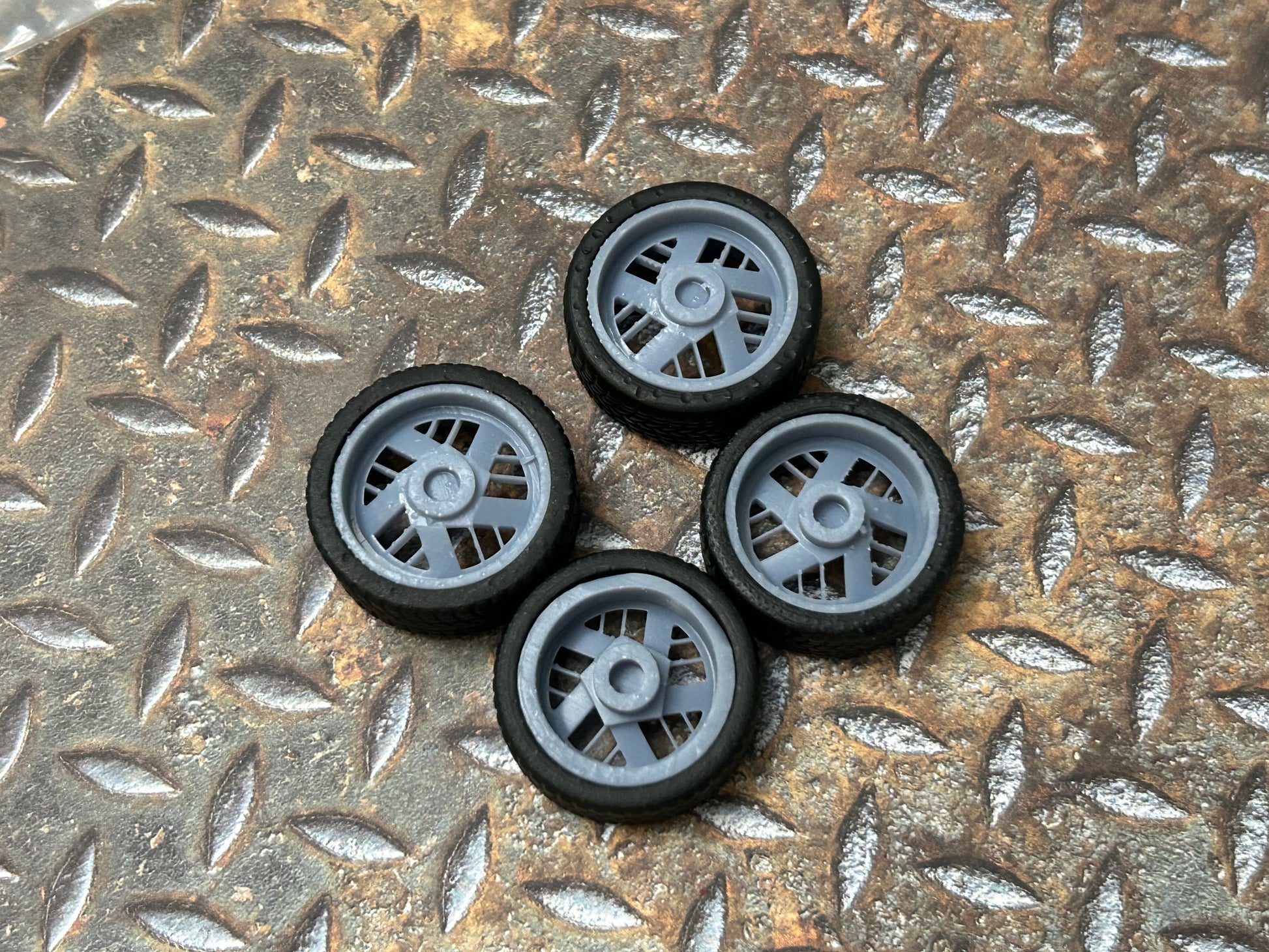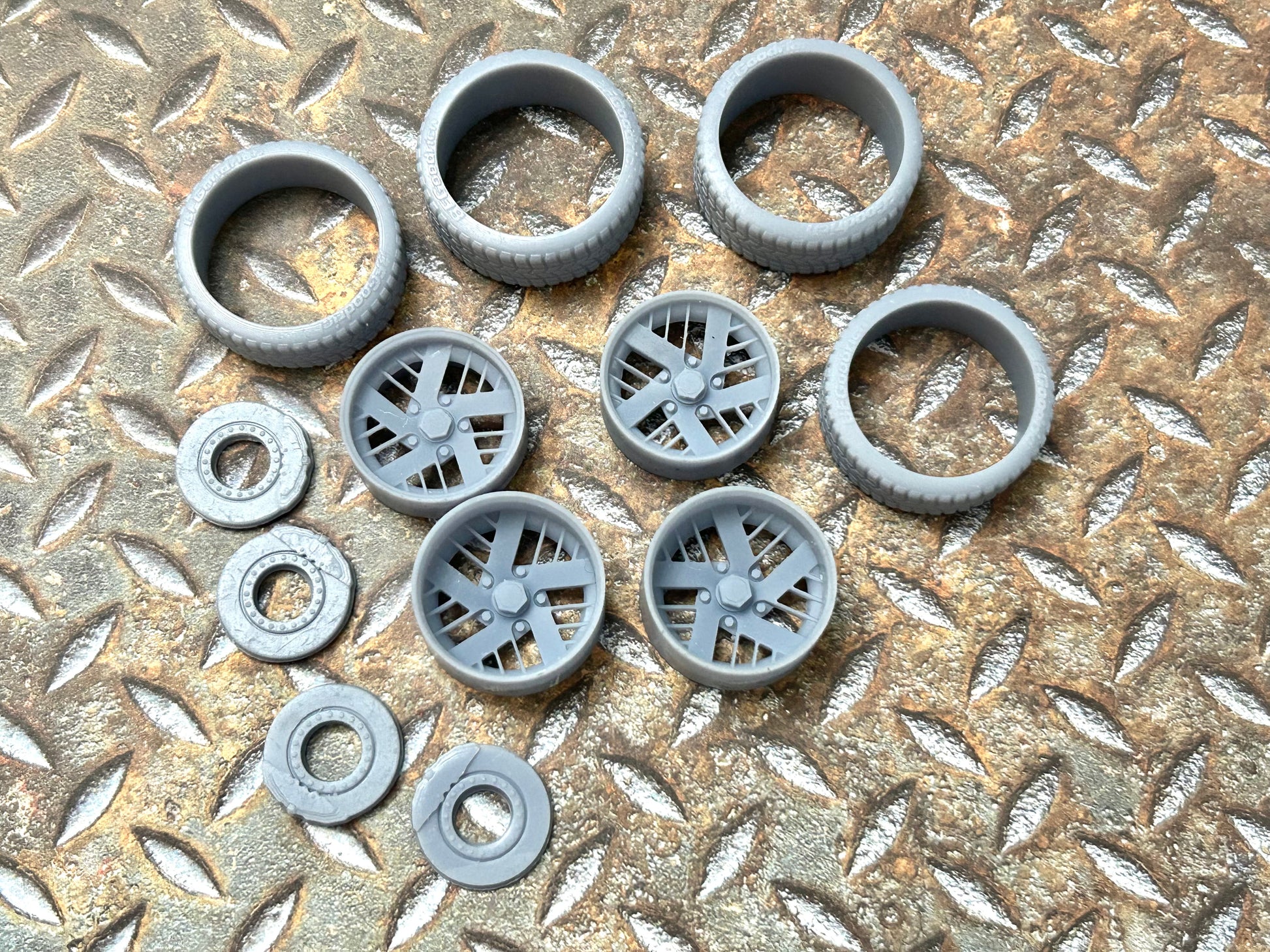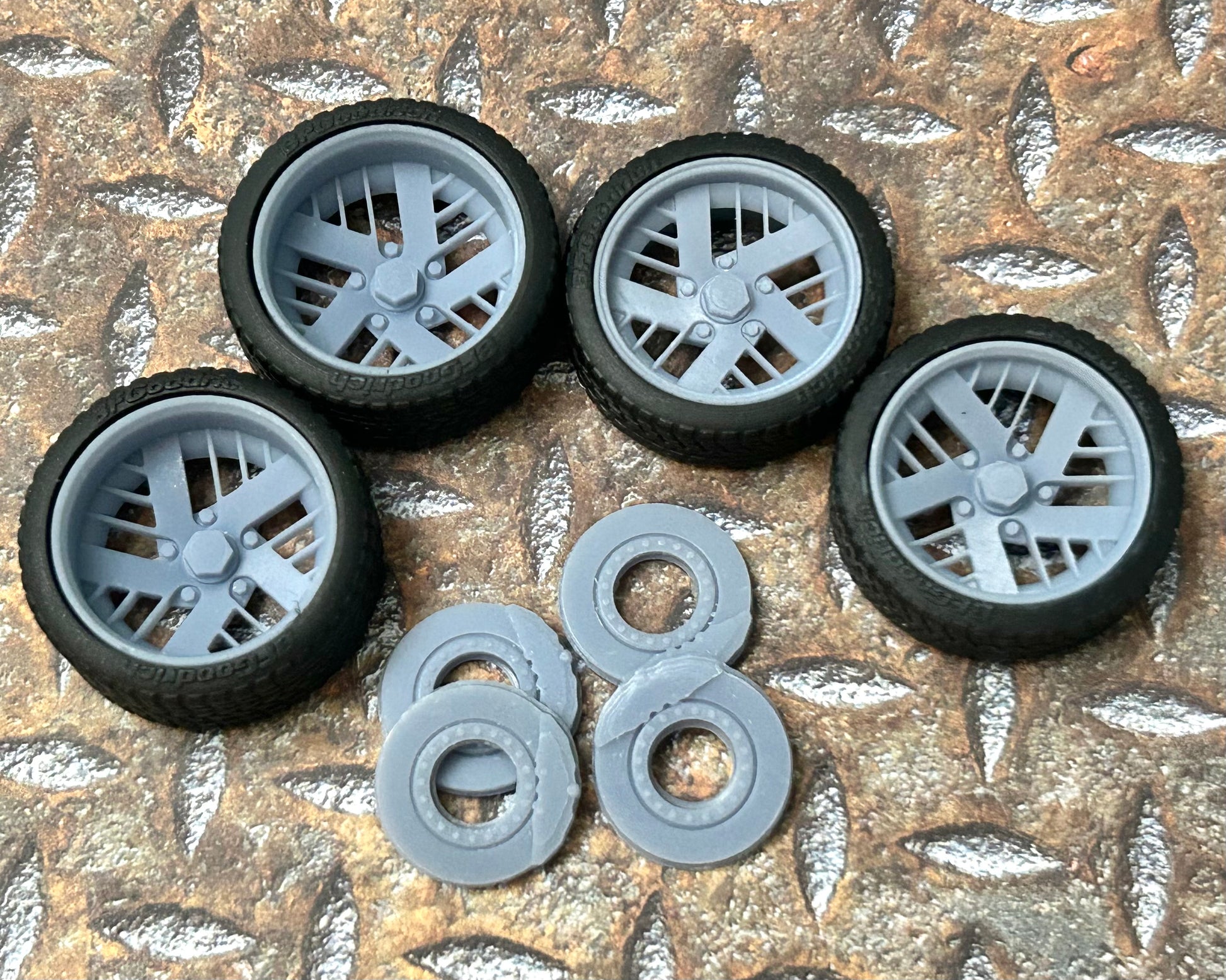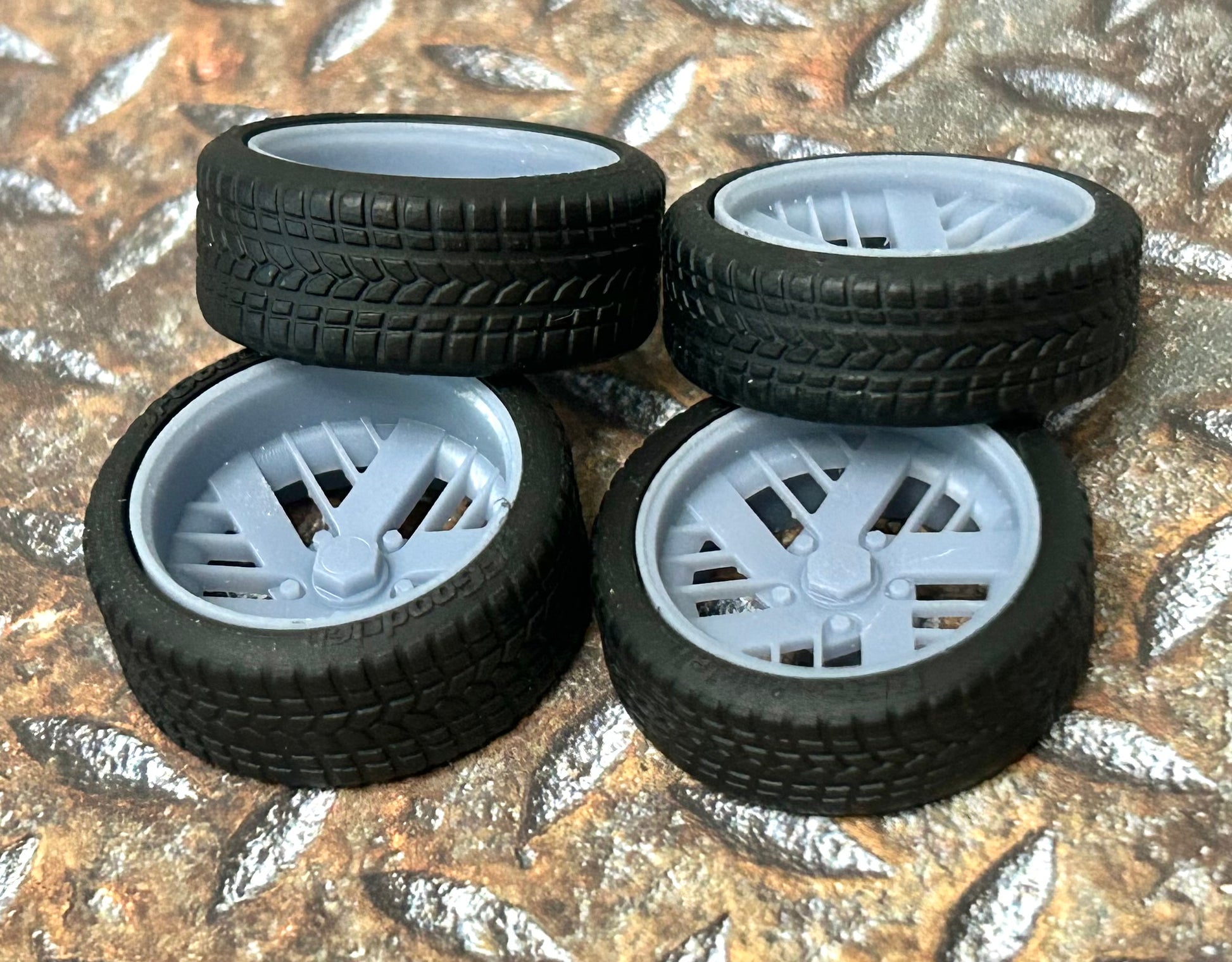 Resin wheels and tires for a 1/24 or 1/25 scale model car.
