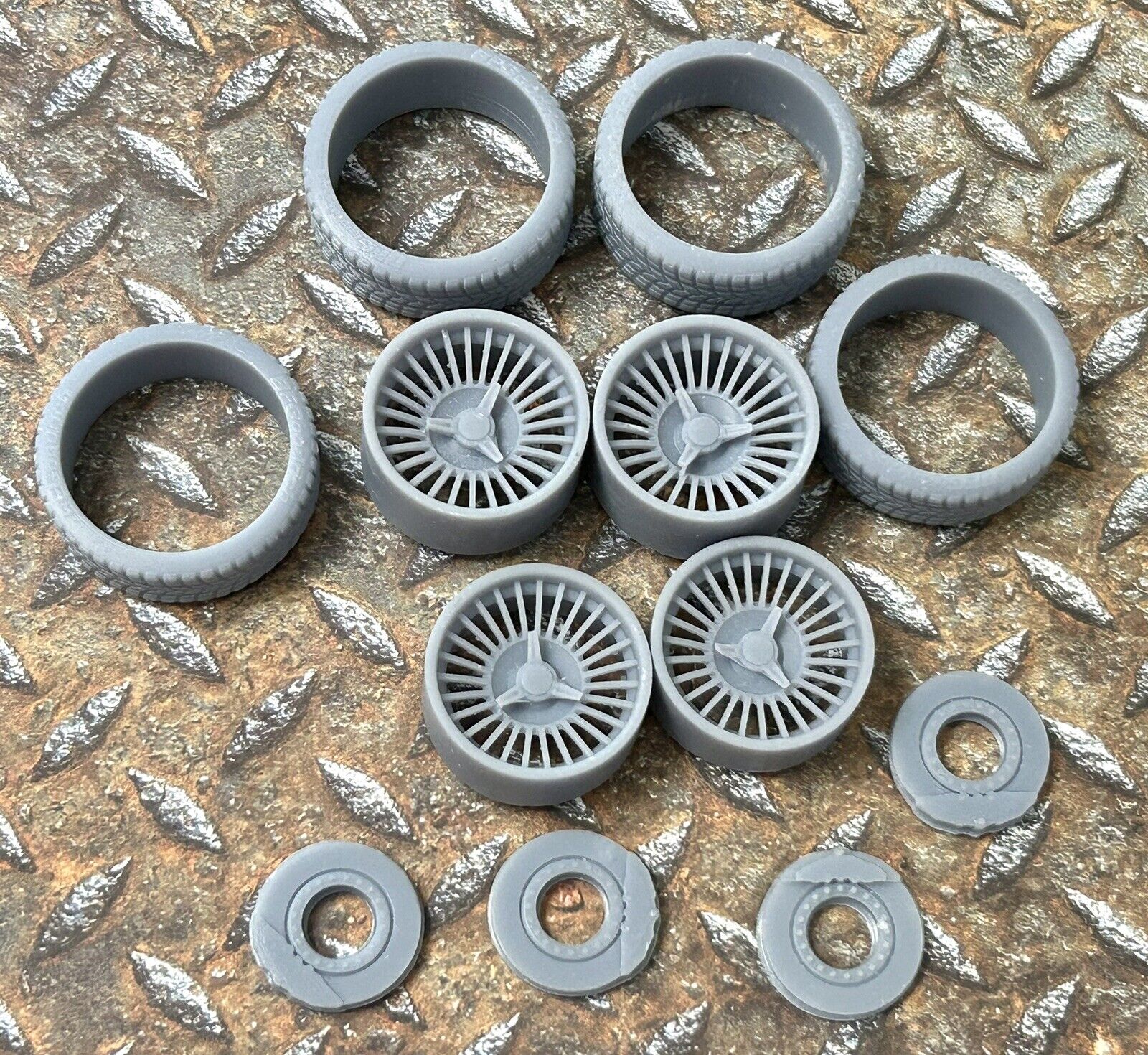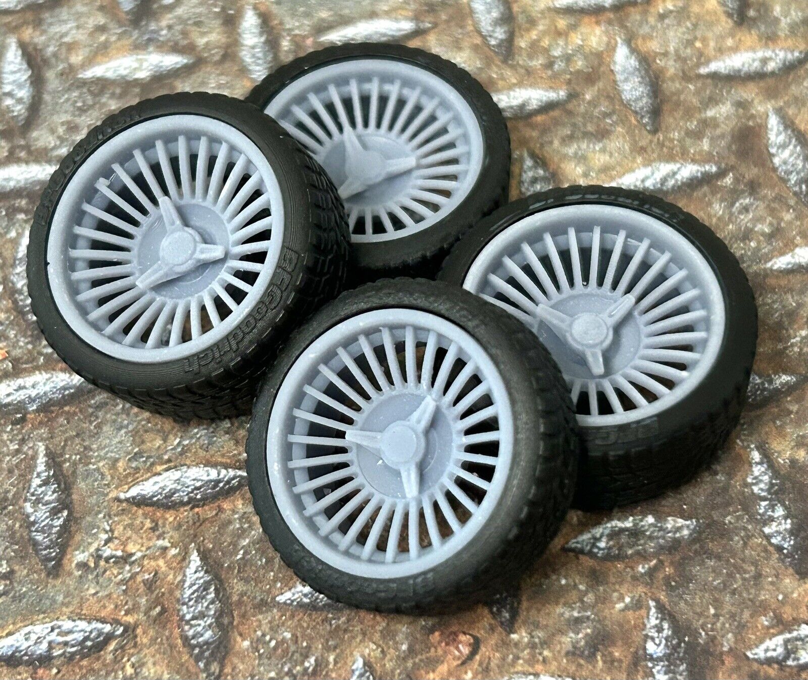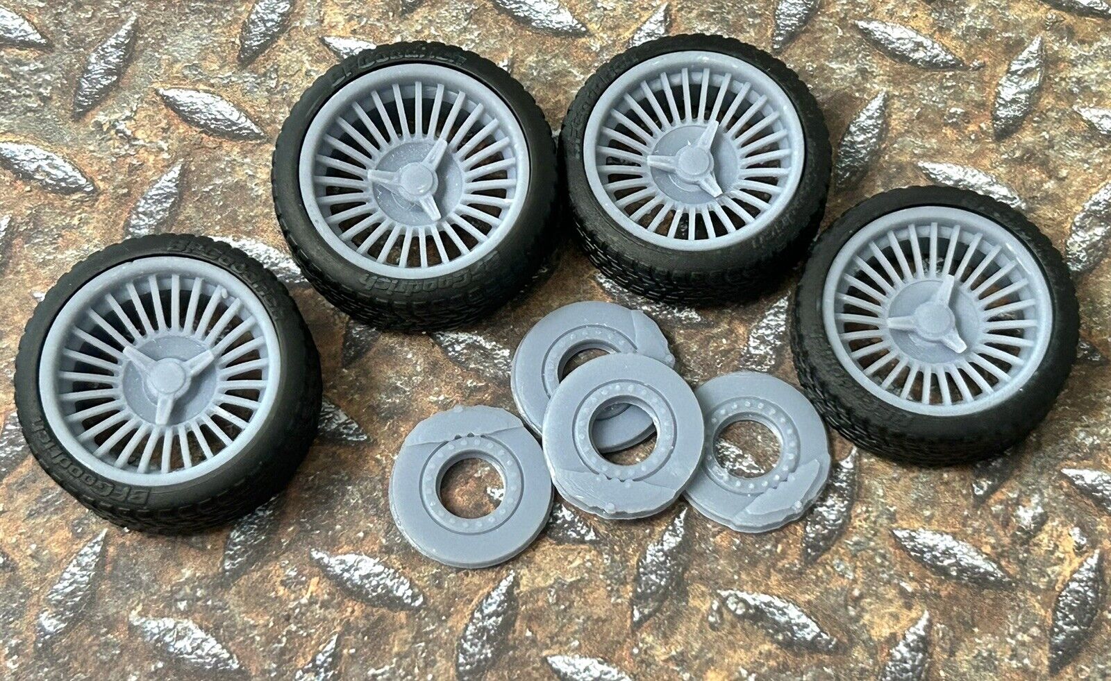 Resin wheels and tires for a 1/24 or 1/25 scale model car.