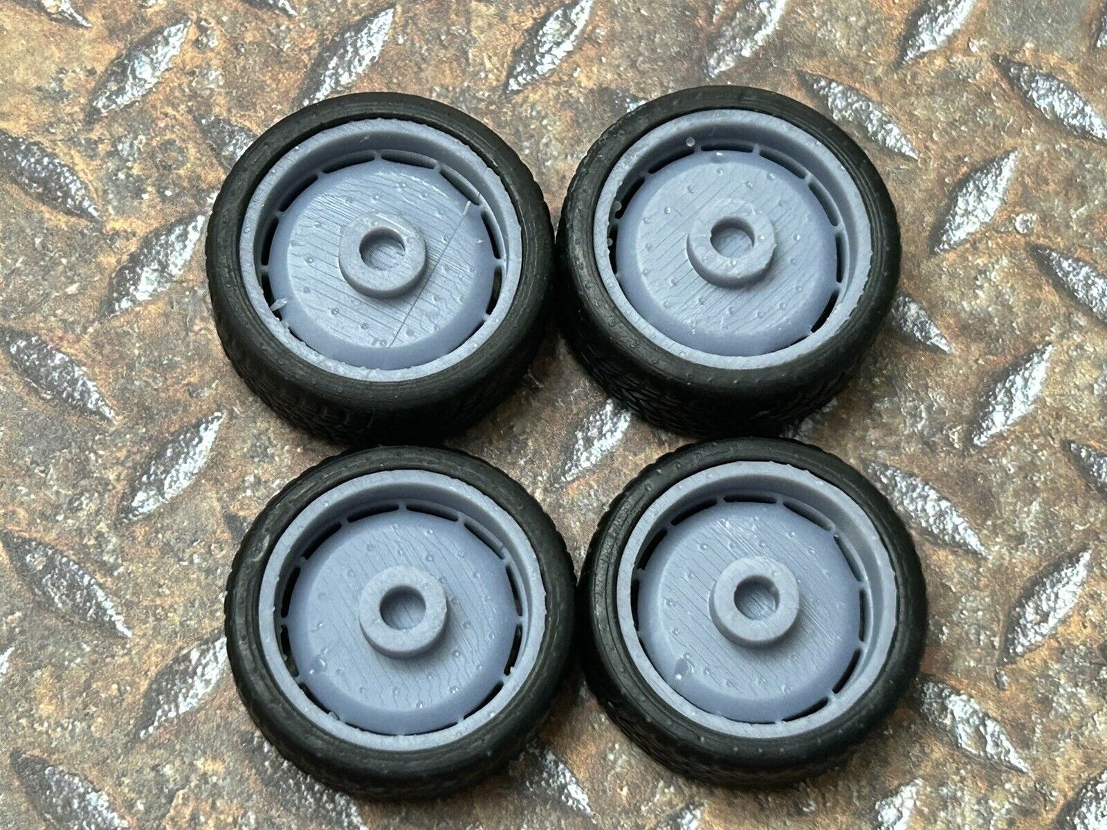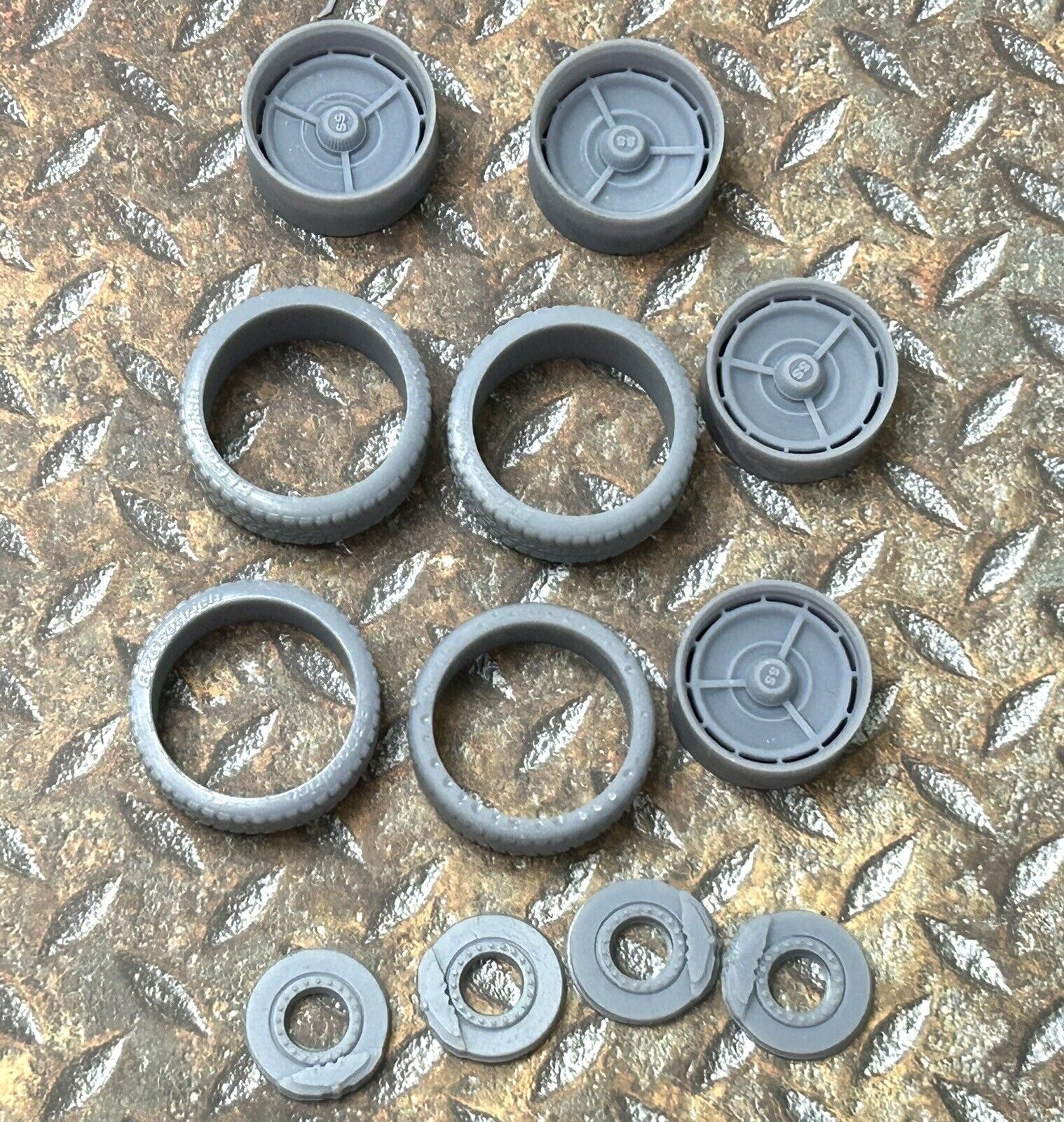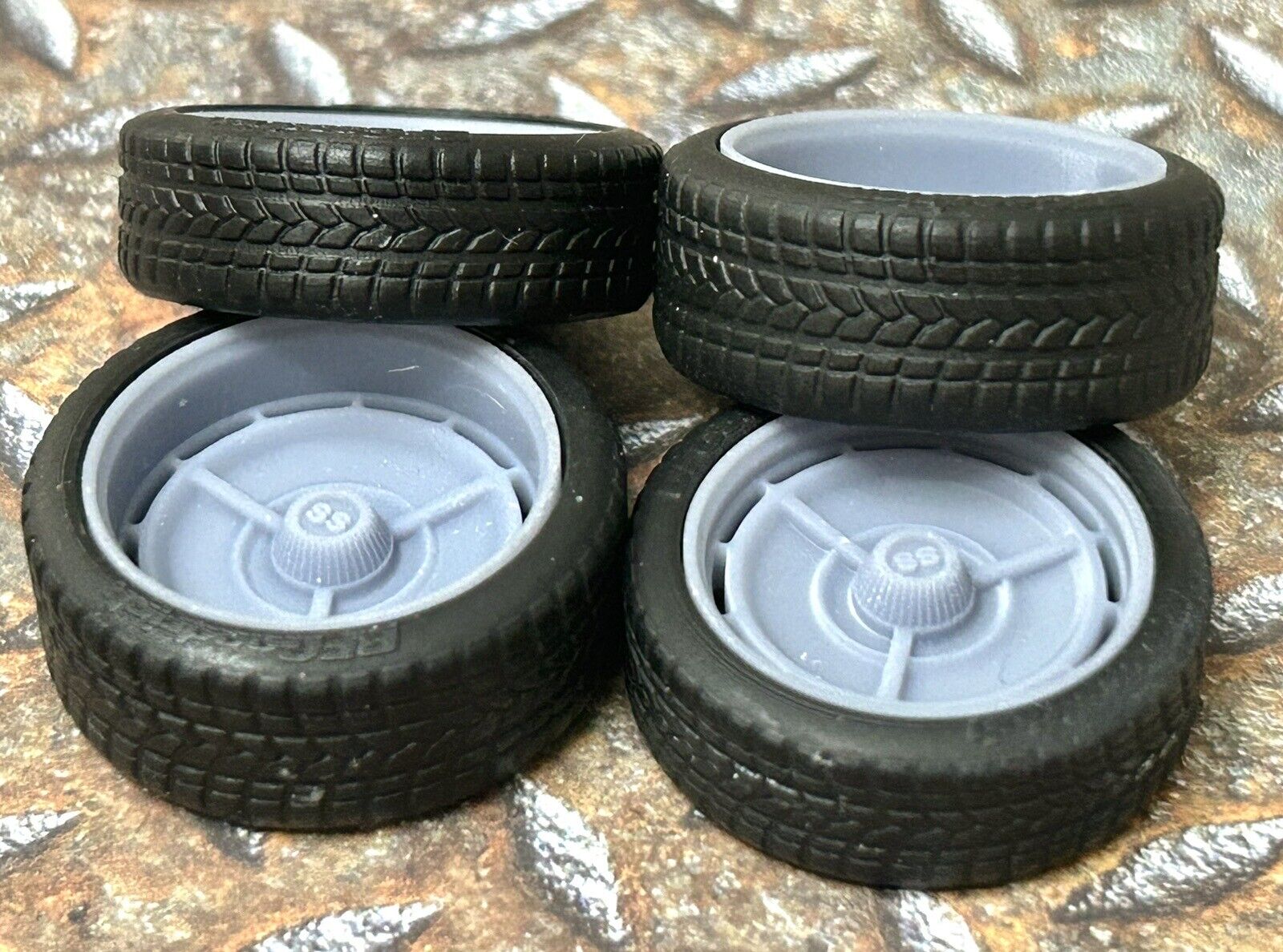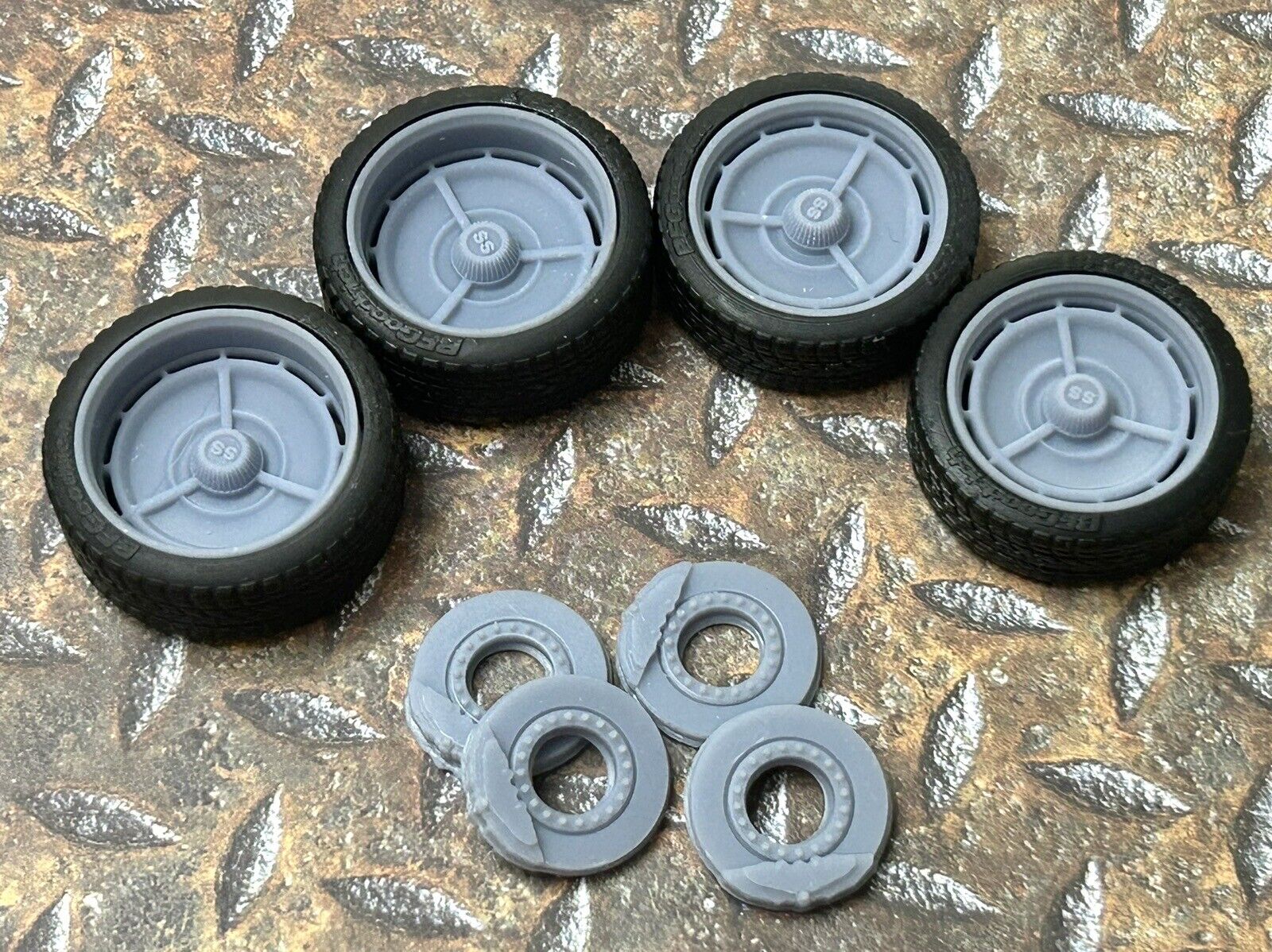 Resin wheels and tires for a 1/24 or 1/25 scale model car.