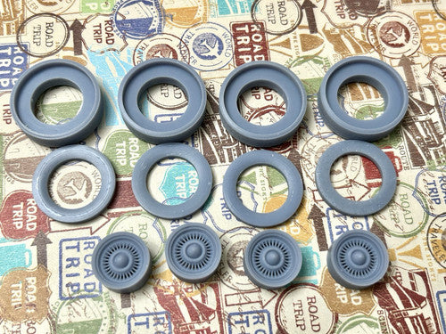 Resin wheels and tires with wide whitewalls for a 1/24 or 1/25 scale model car.