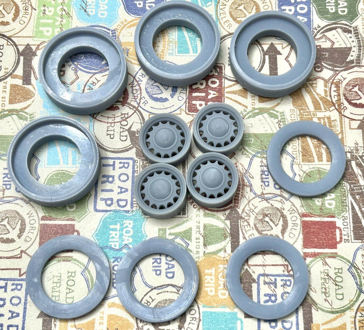 Resin wheels and tires with wide whitewalls for a 1/24 or 1/25 scale model car.