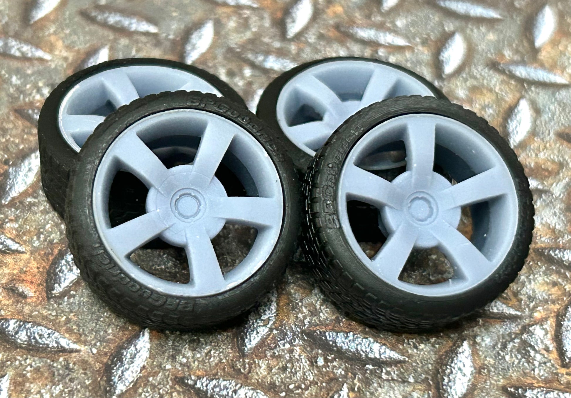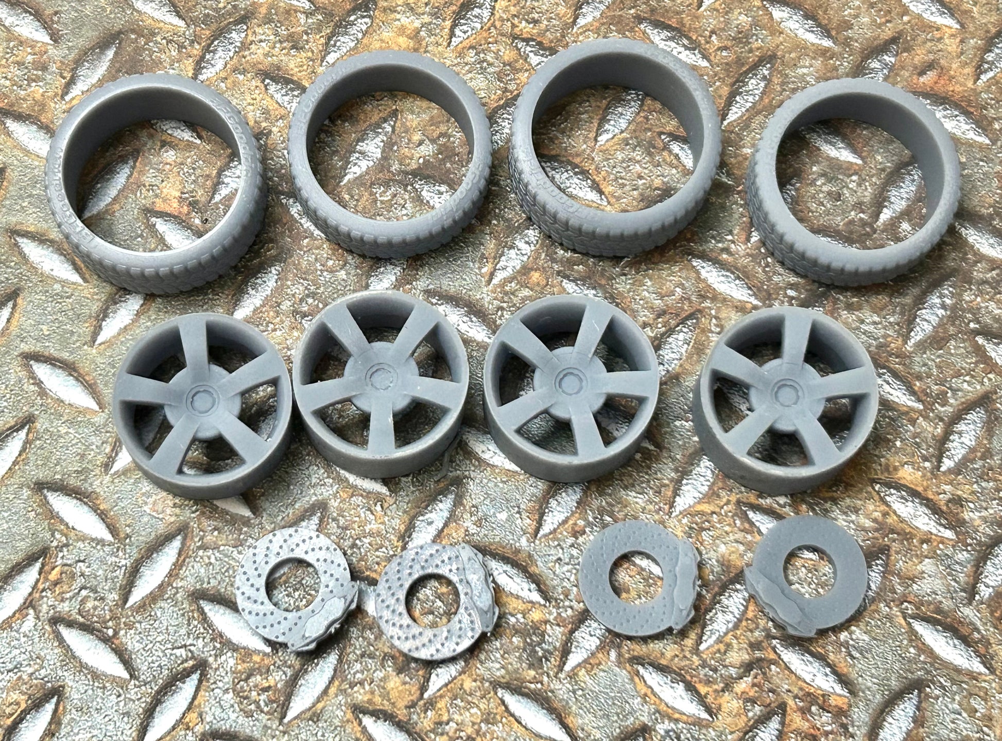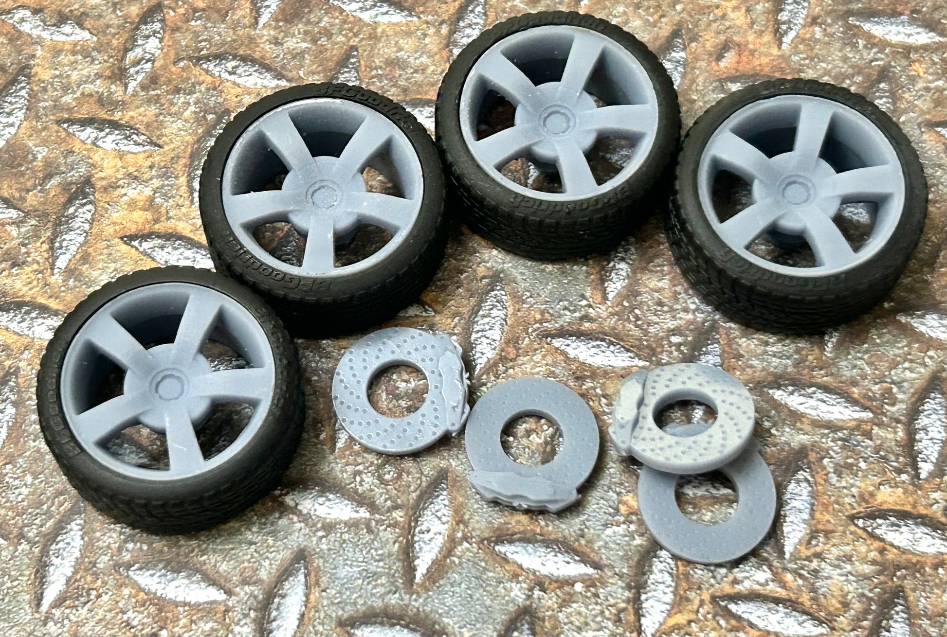 Resin wheels and tires for a 1/24 or 1/25 scale model car.