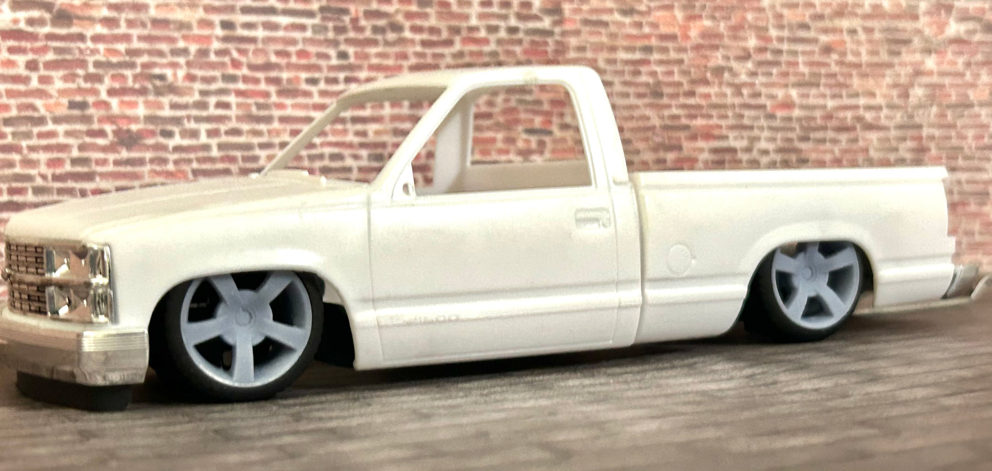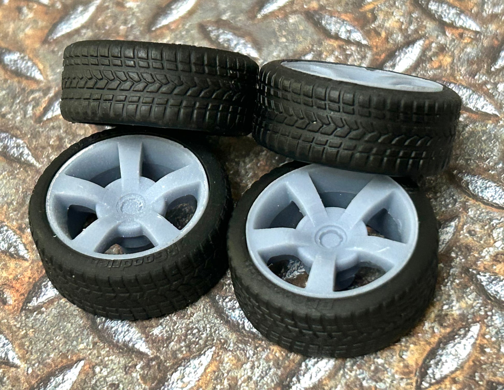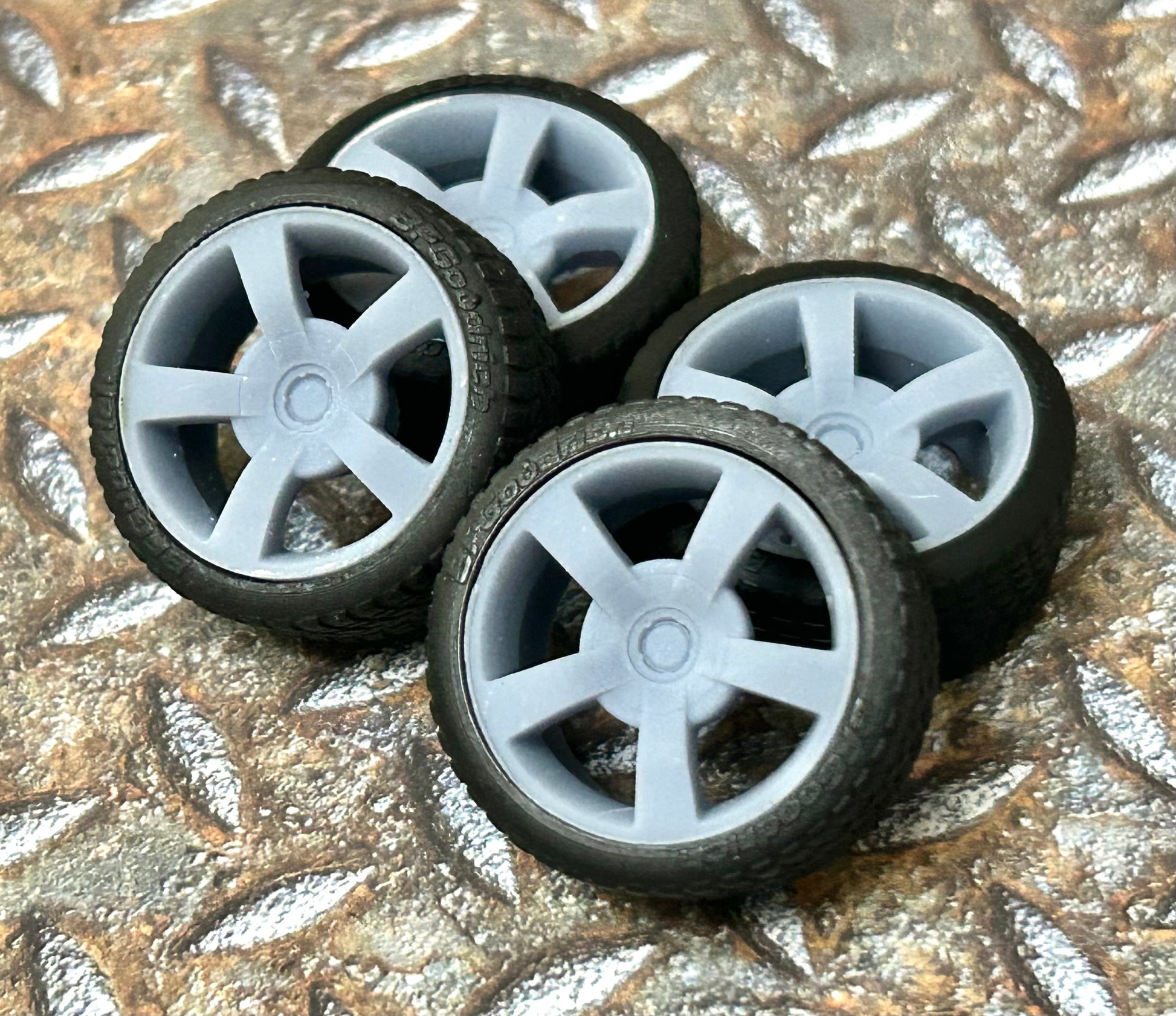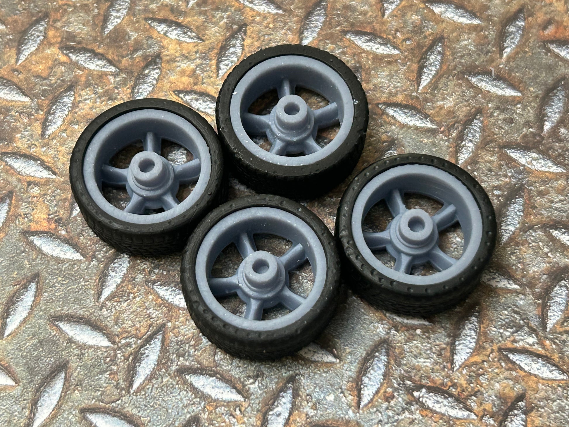 Resin wheels and tires for a 1/24 or 1/25 scale model car.
