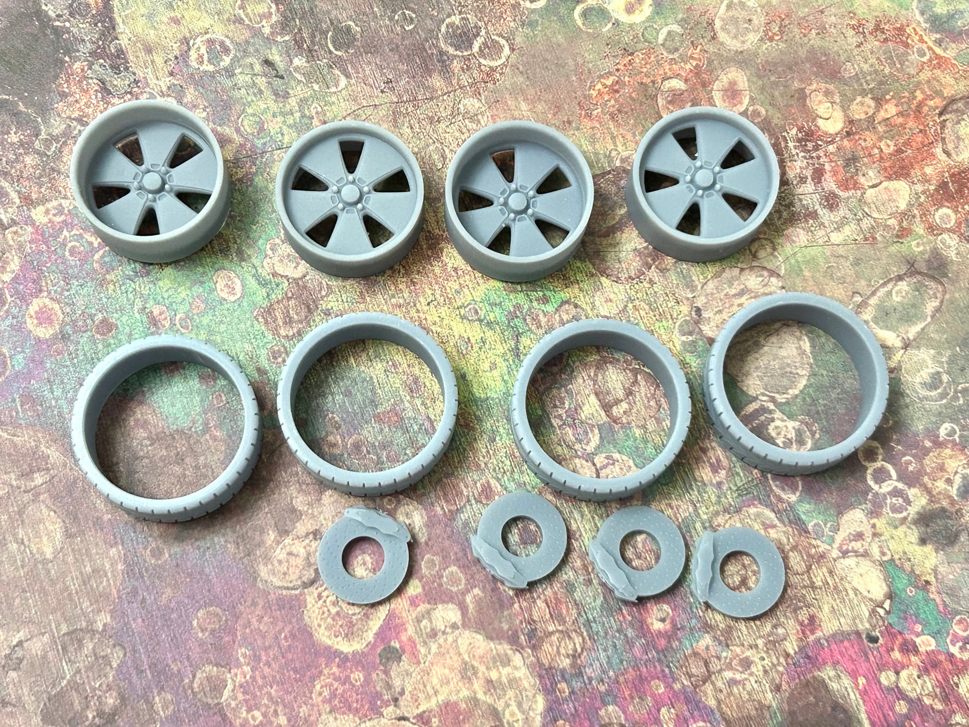 Resin wheels and tires for a 1/24 or 1/25 scale model car.