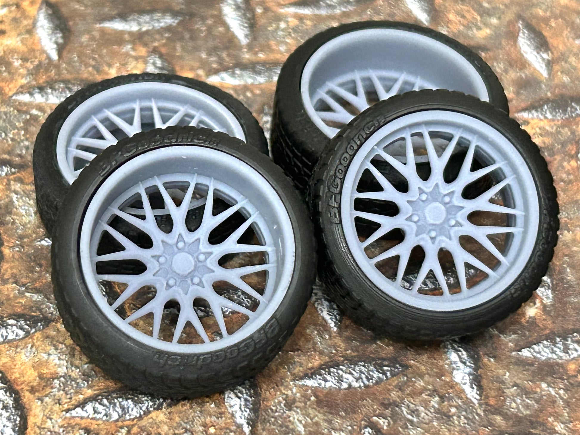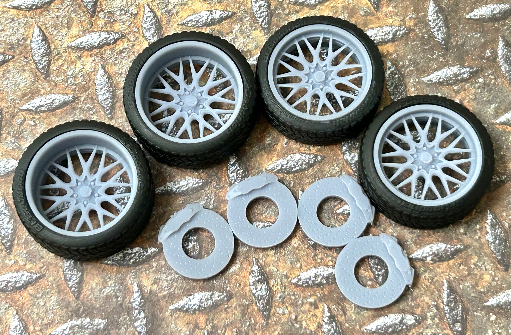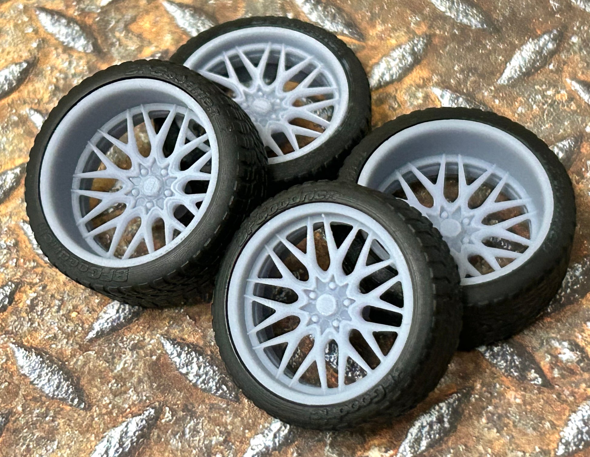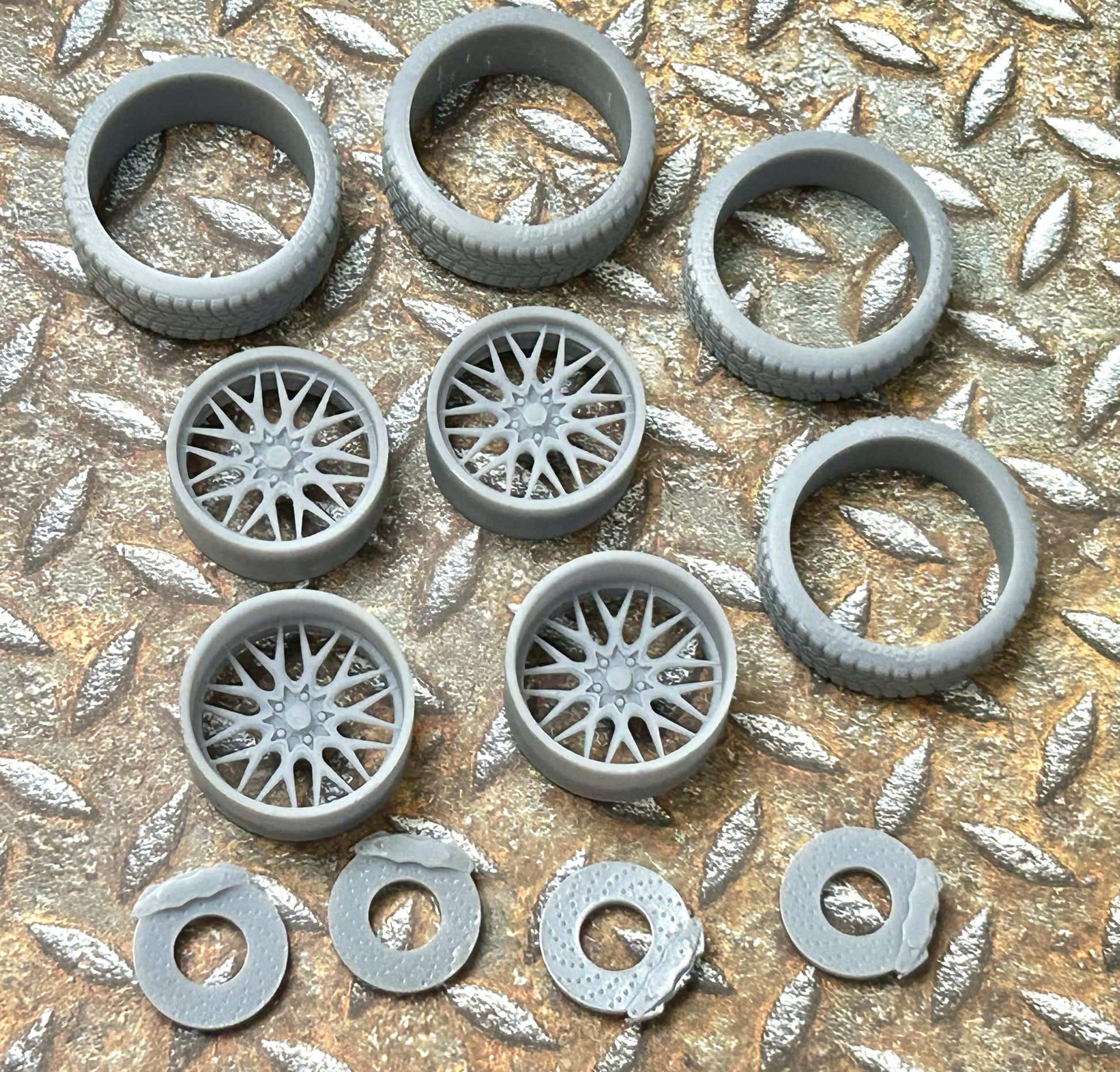 Resin wheels and tires for a 1/24 or 1/25 scale model car.