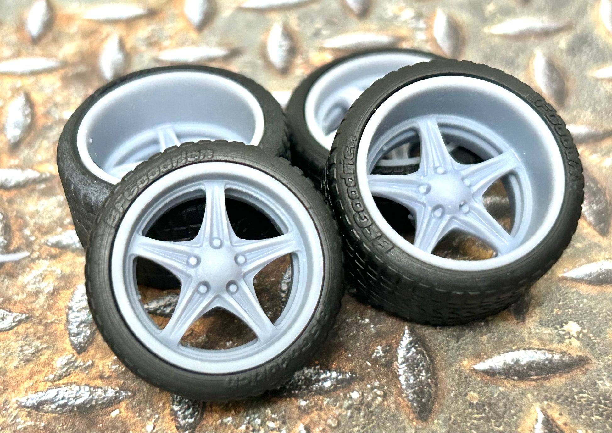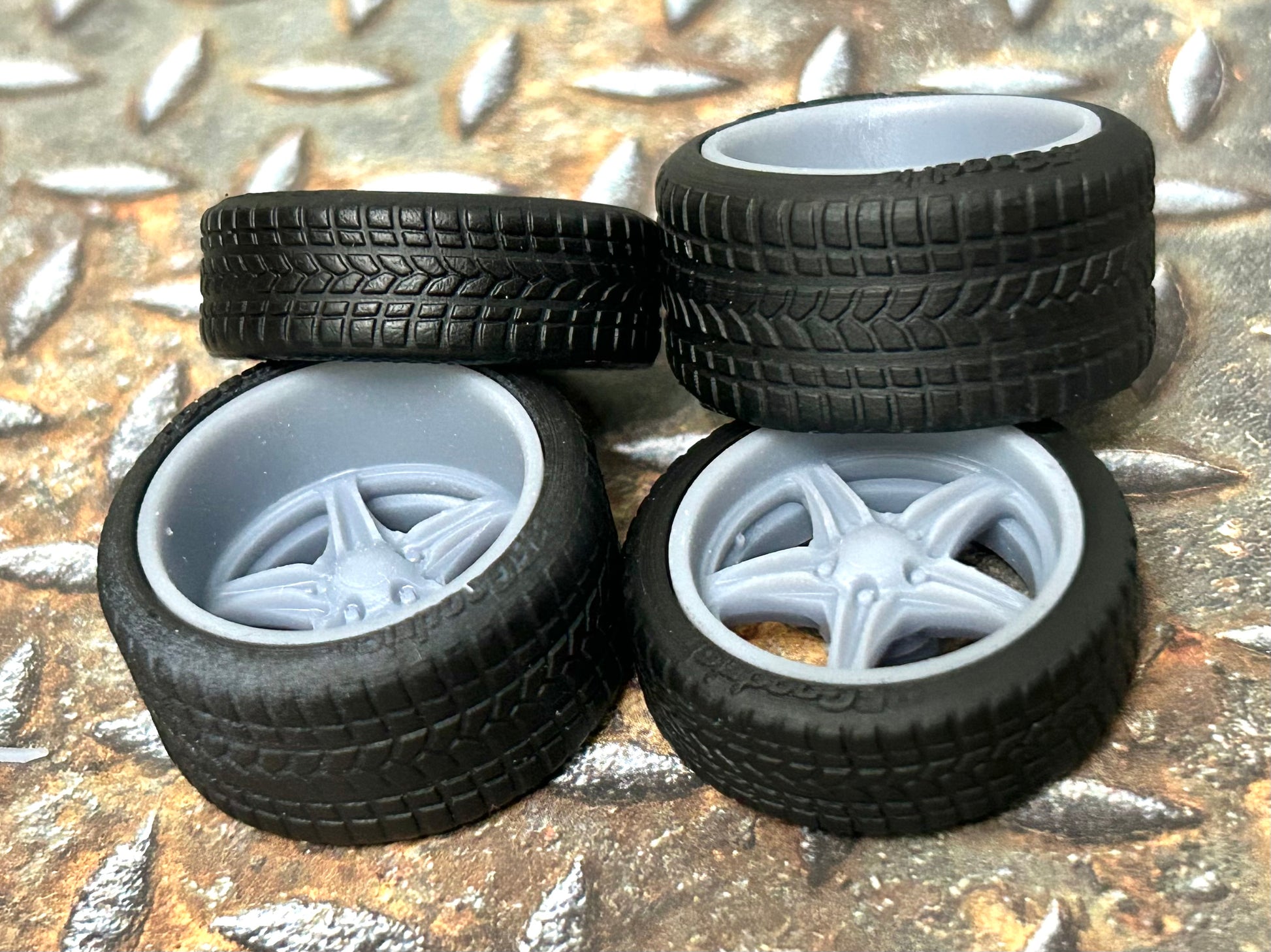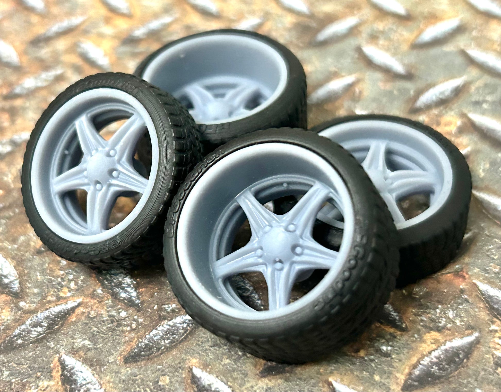 Resin wheels and tires for a 1/24 or 1/25 scale model car.