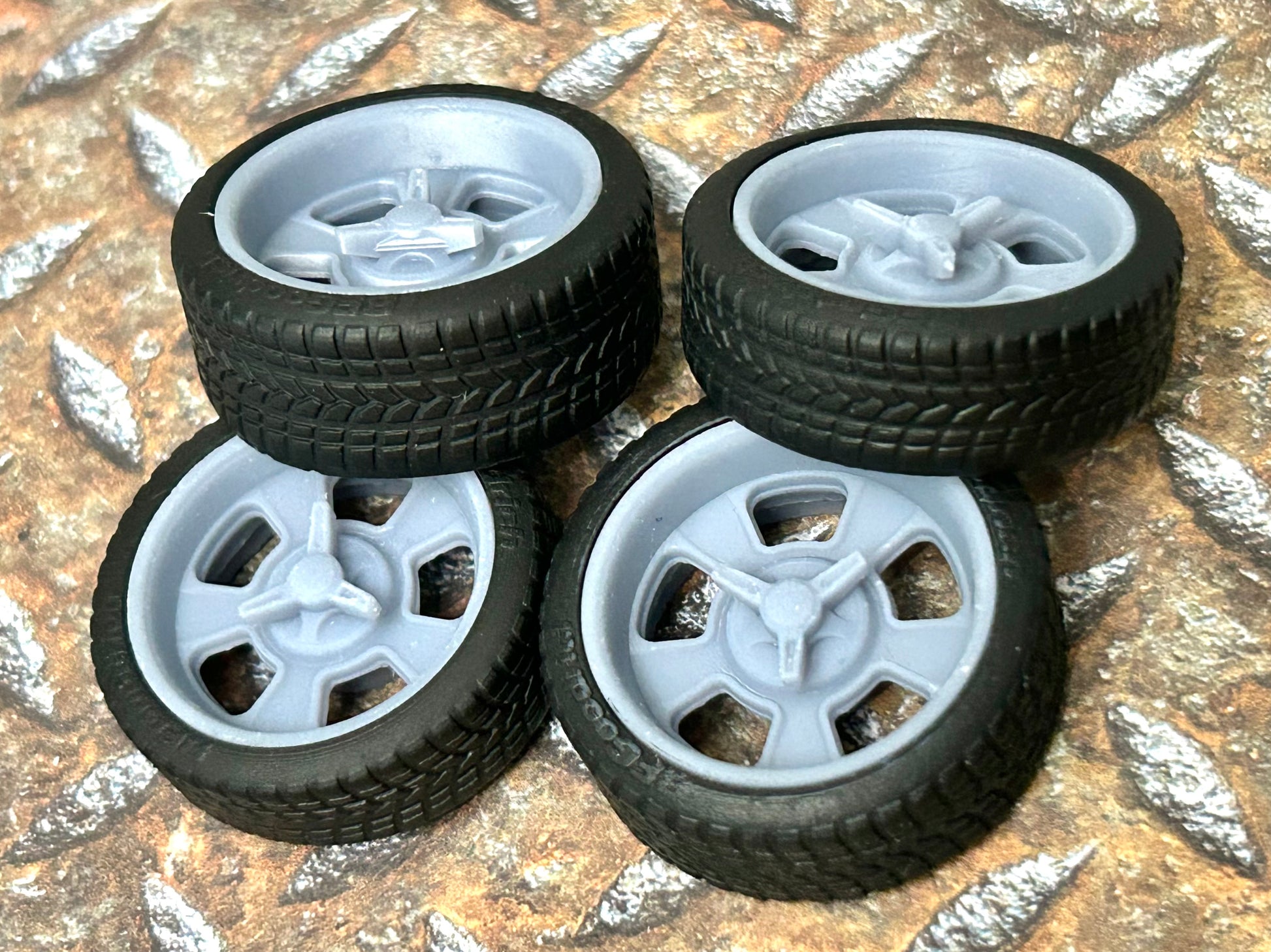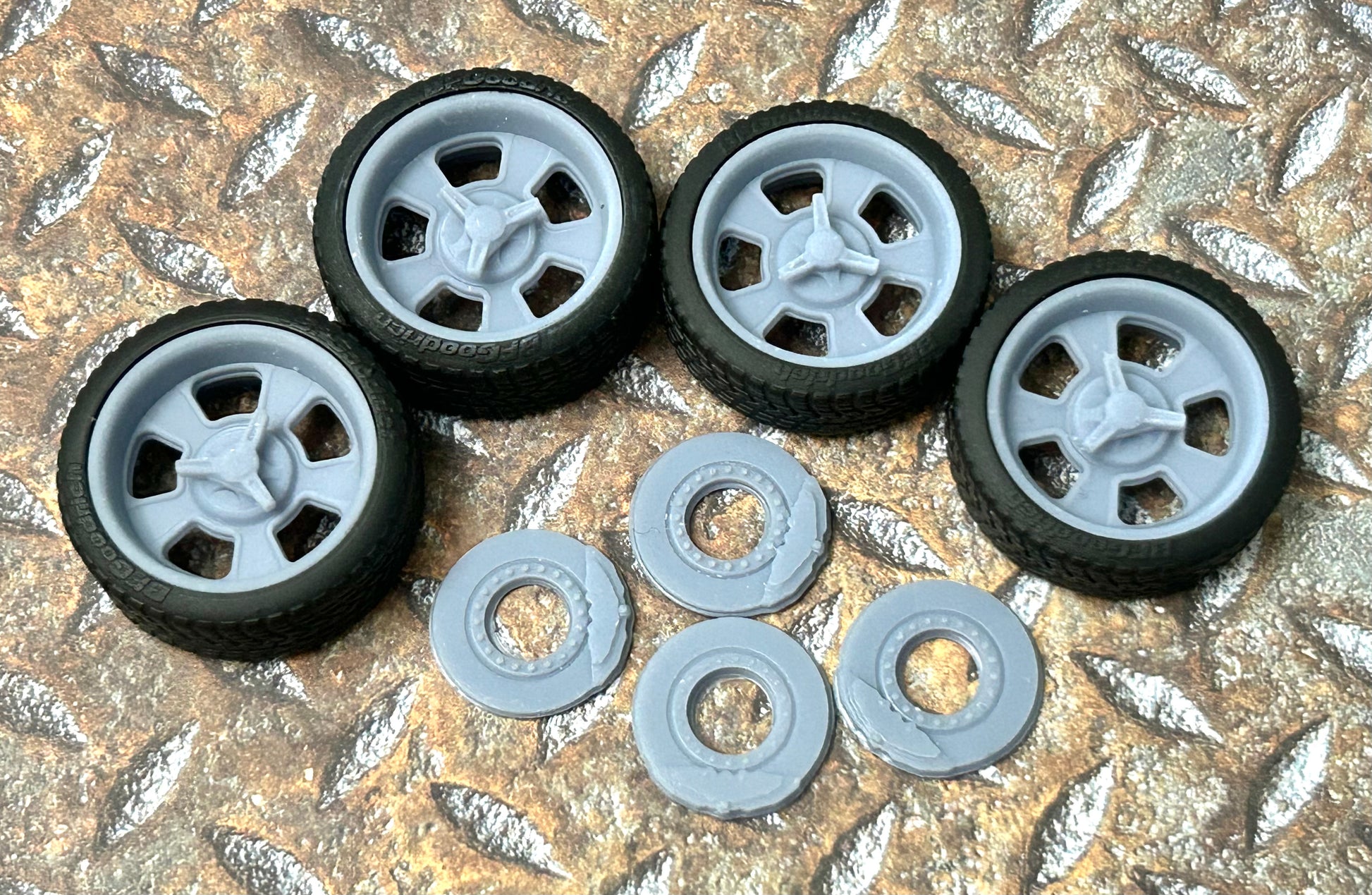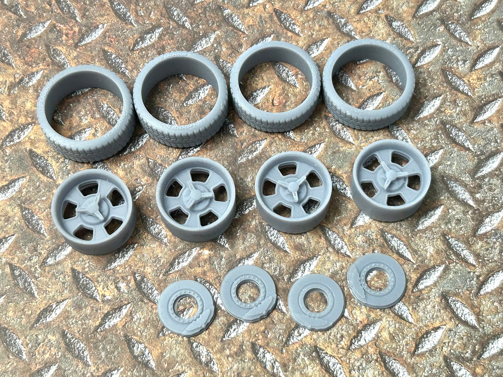 Resin wheels and tires for a 1/24 or 1/25 scale model car.