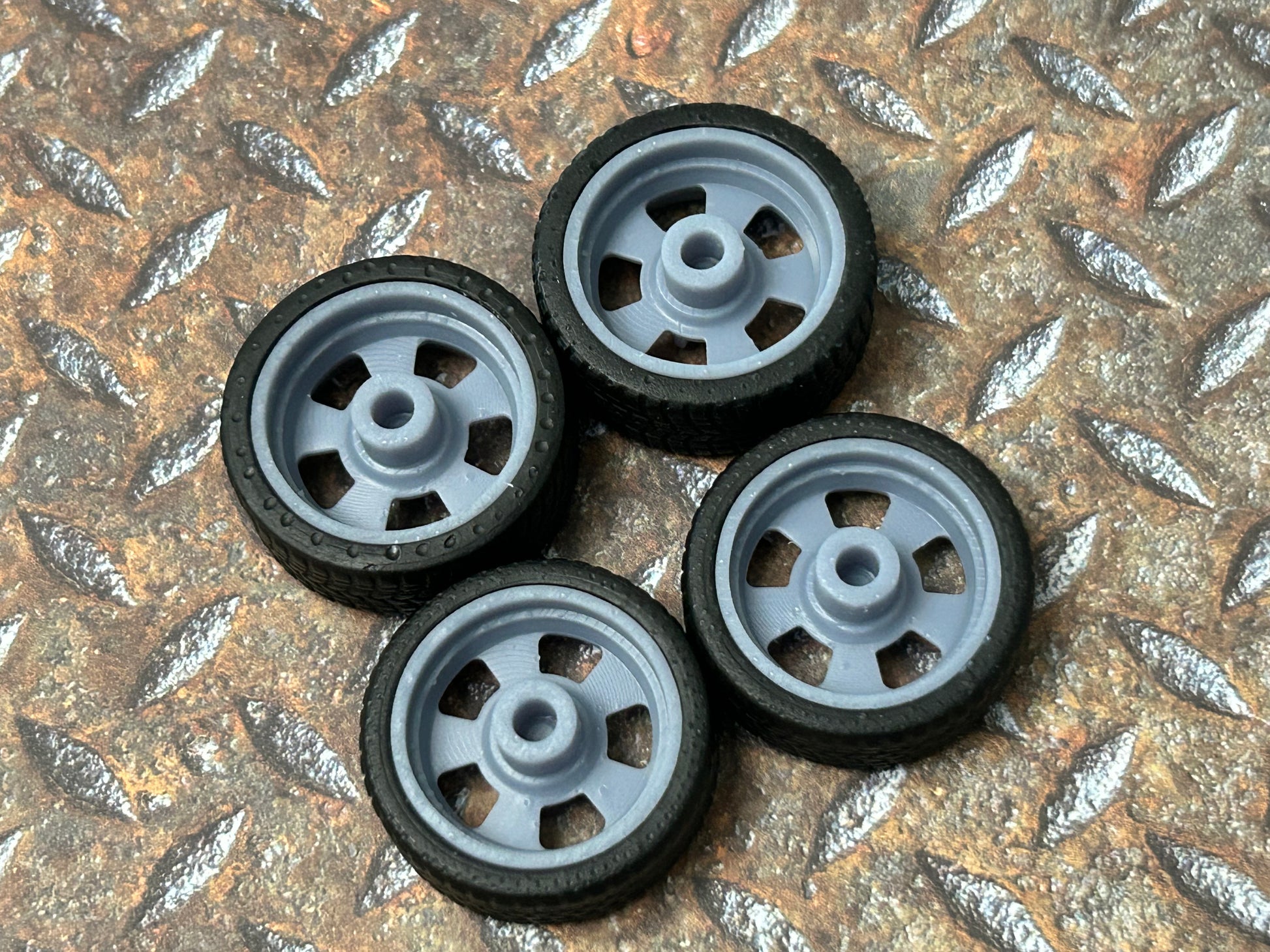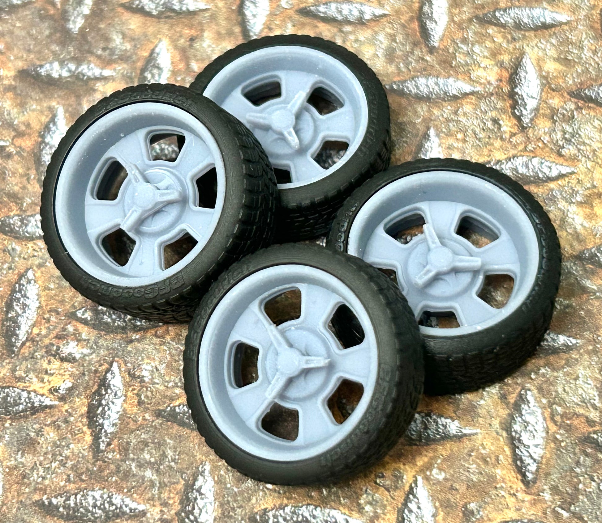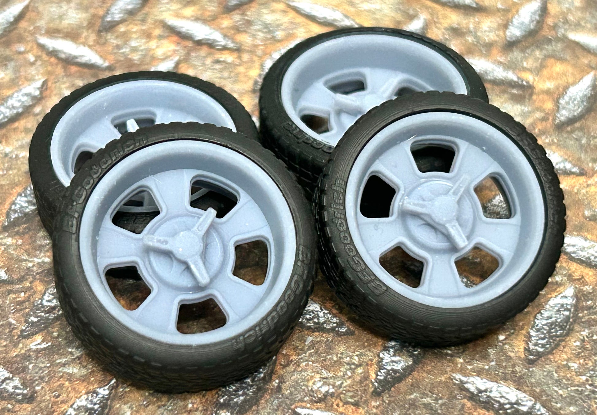 Resin wheels and tires for a 1/24 or 1/25 scale model car.