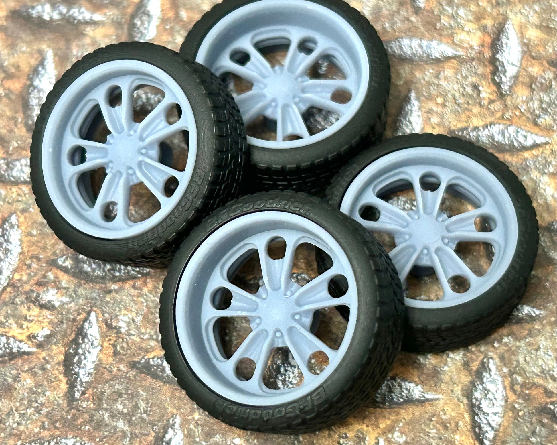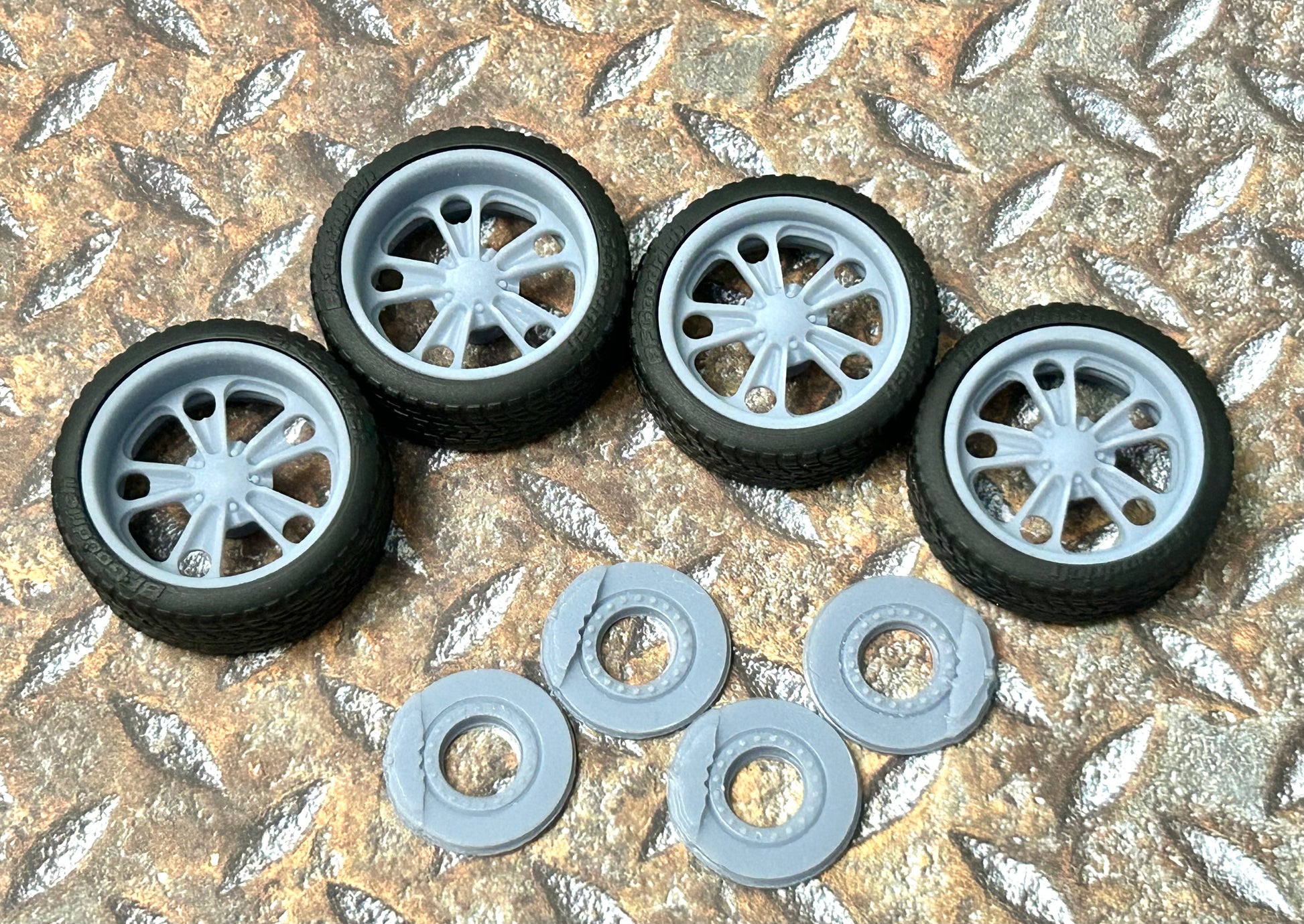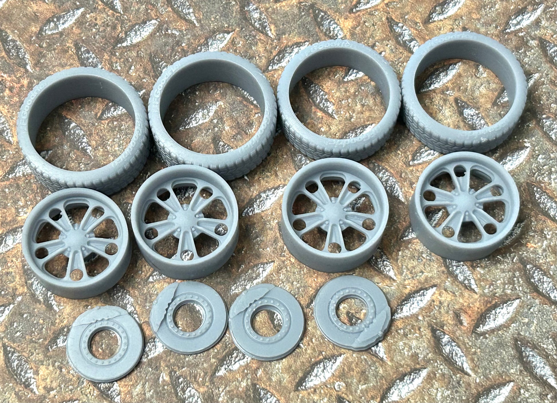 Resin wheels and tires for a 1/24 or 1/25 scale model car.