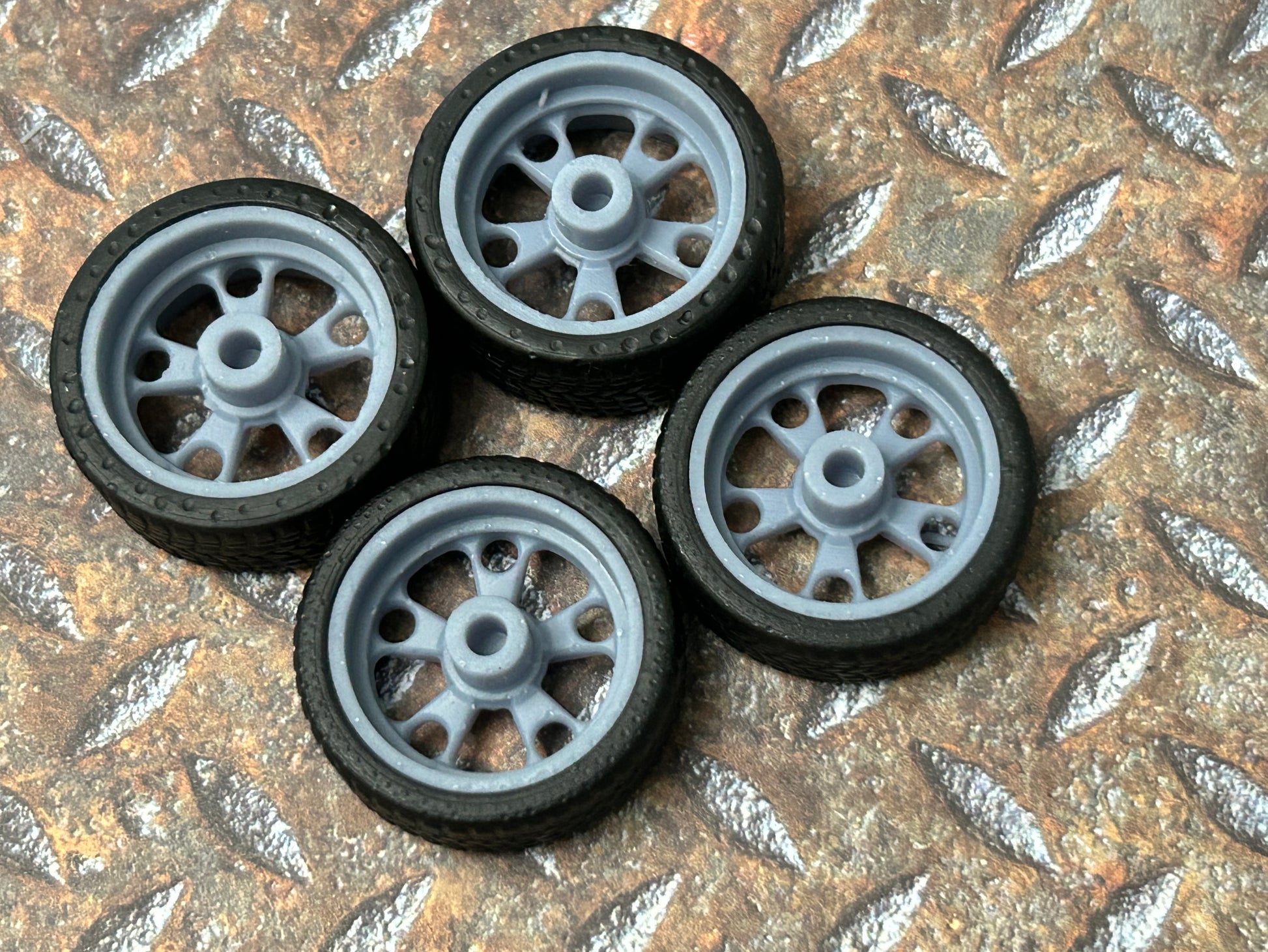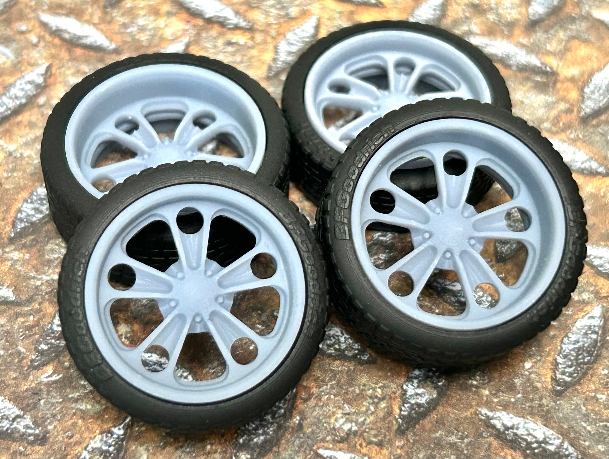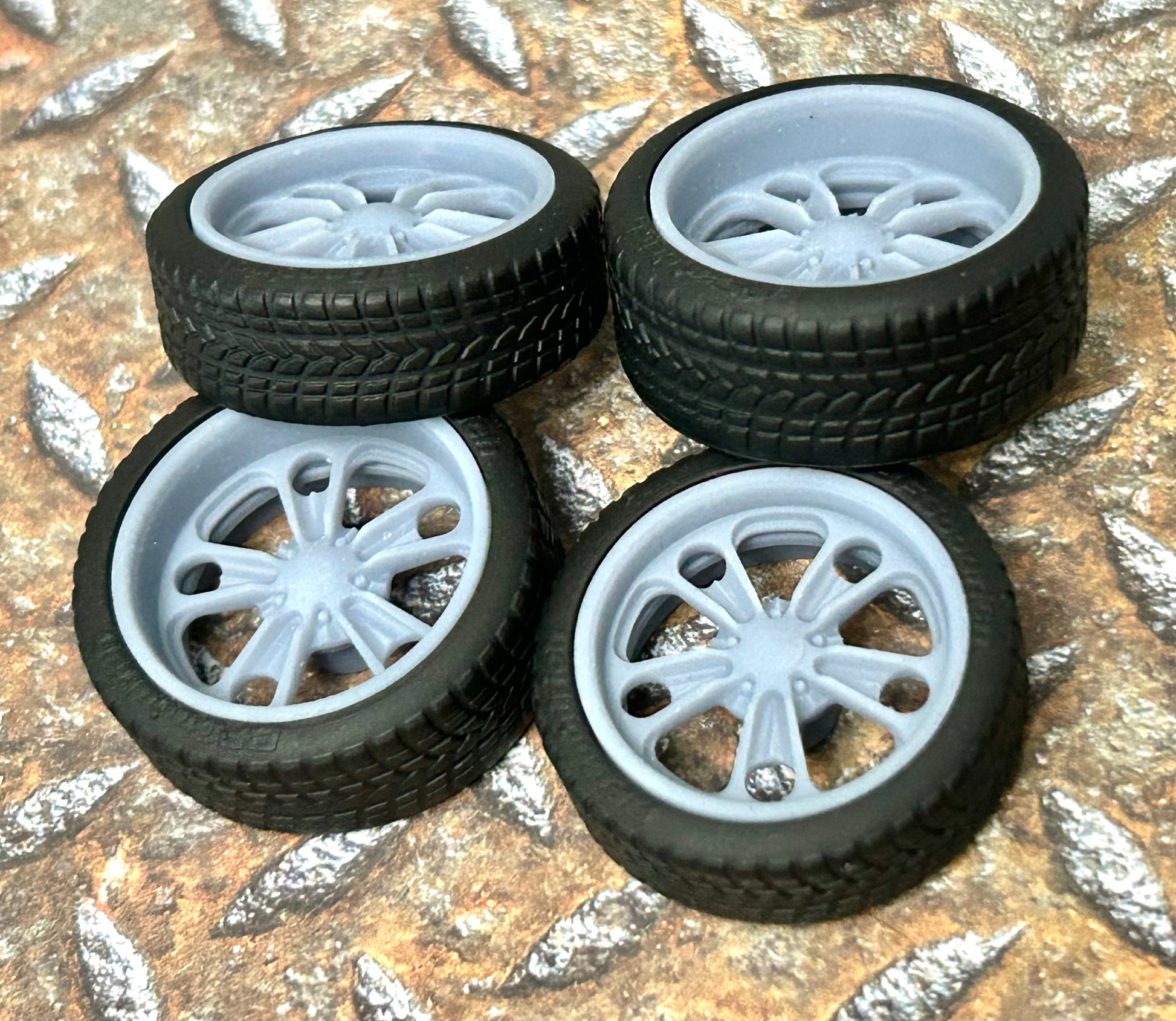 Resin wheels and tires for a 1/24 or 1/25 scale model car.