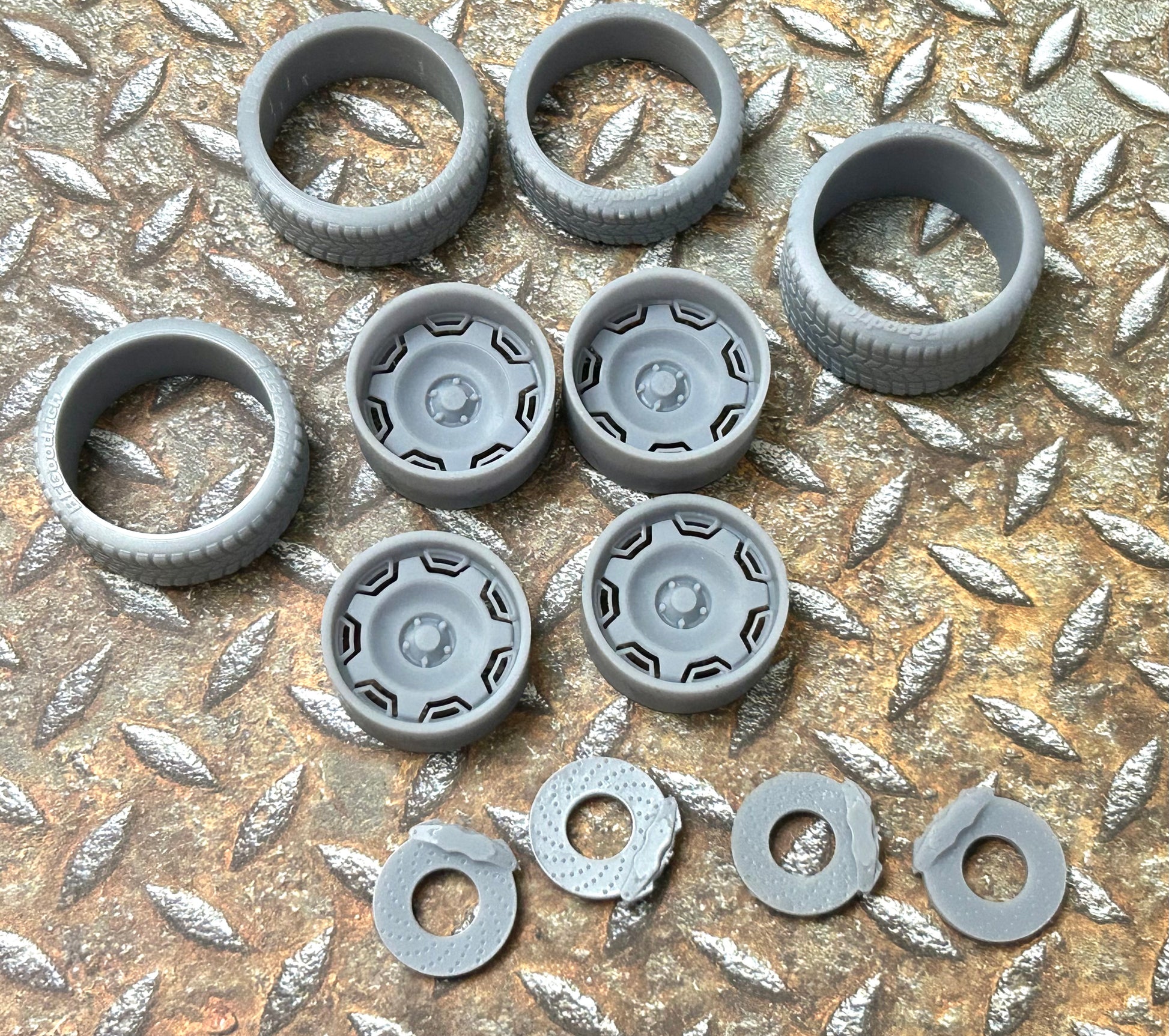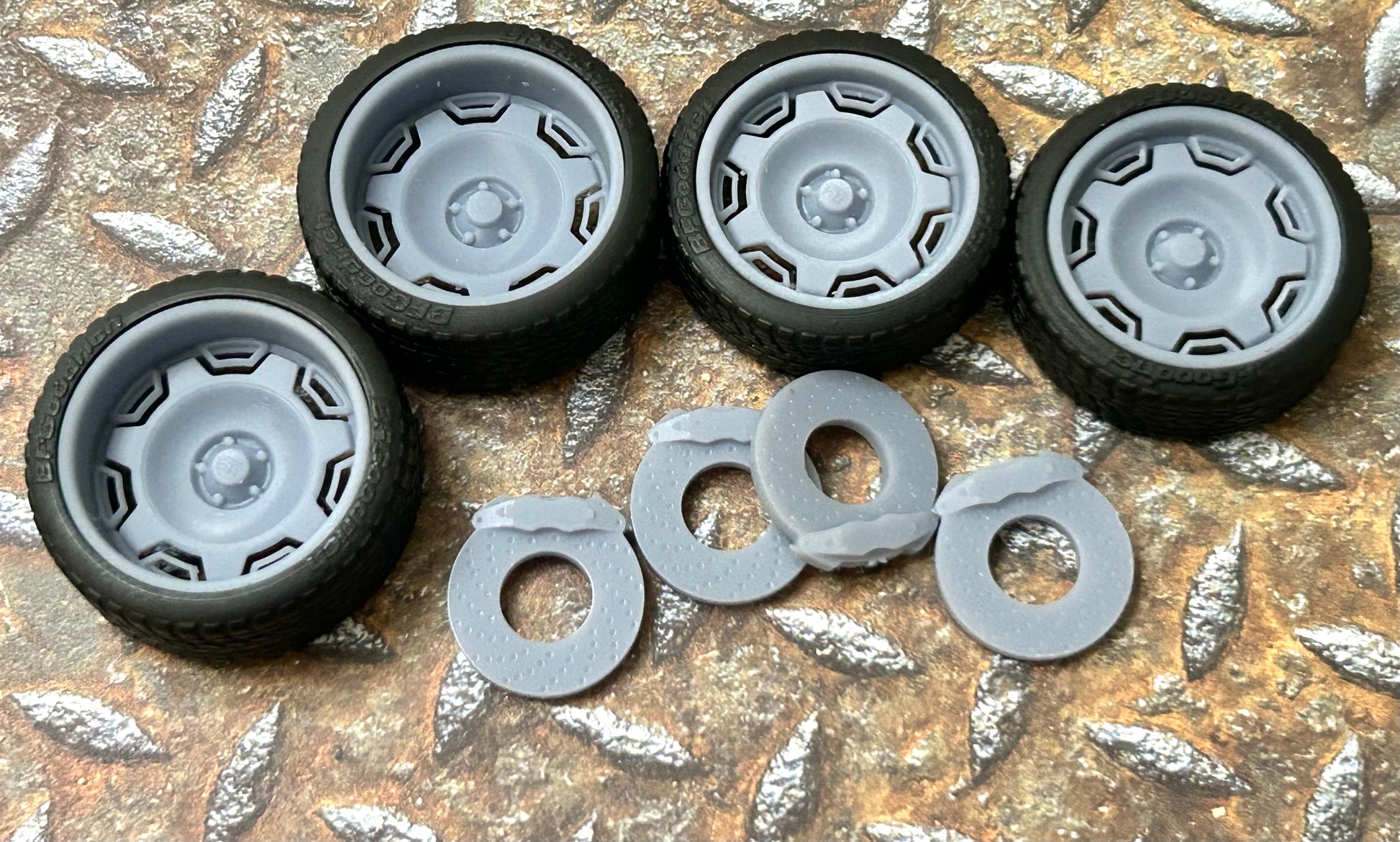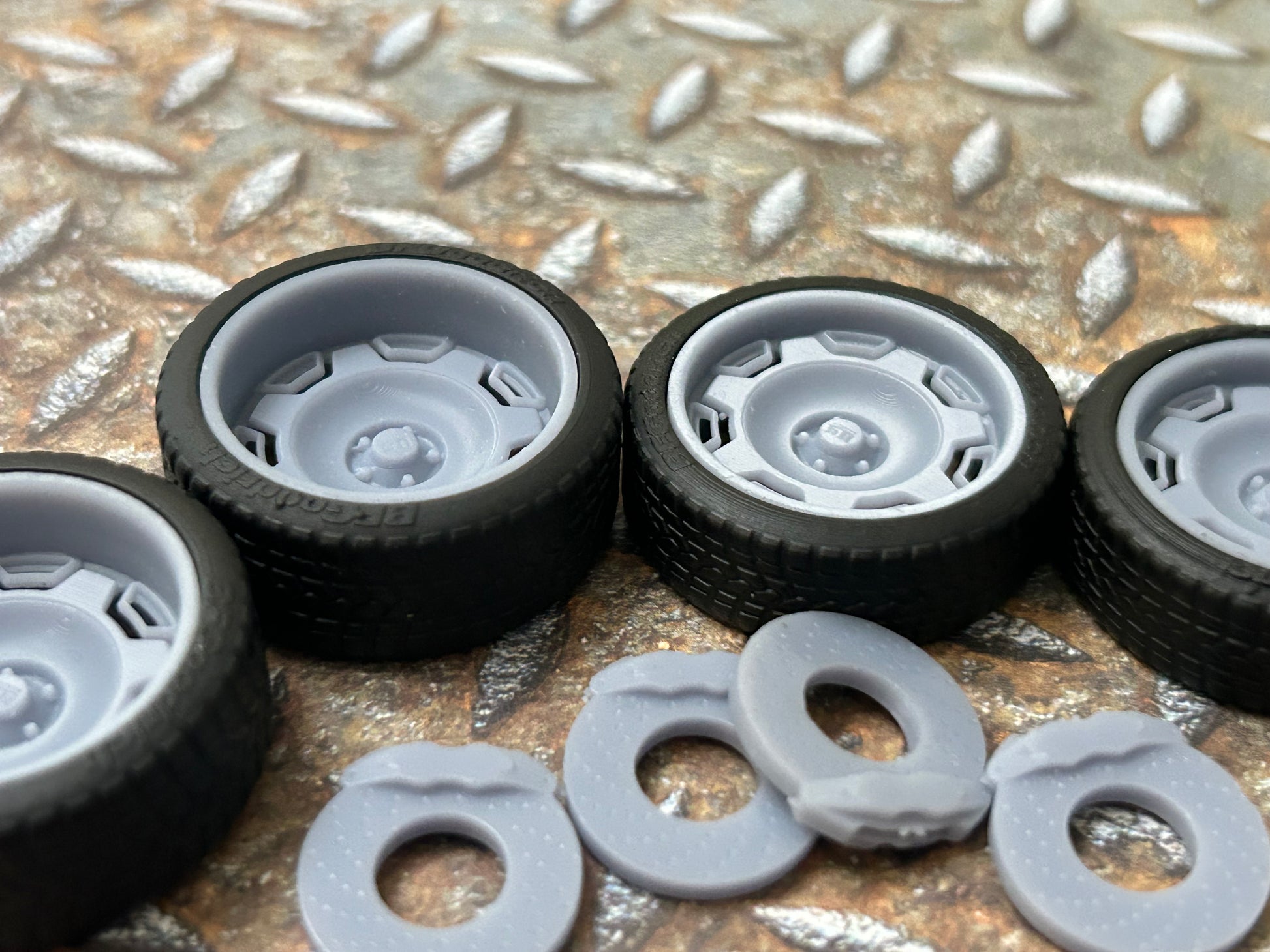 Resin wheels and tires for a 1/24 or 1/25 scale model car.