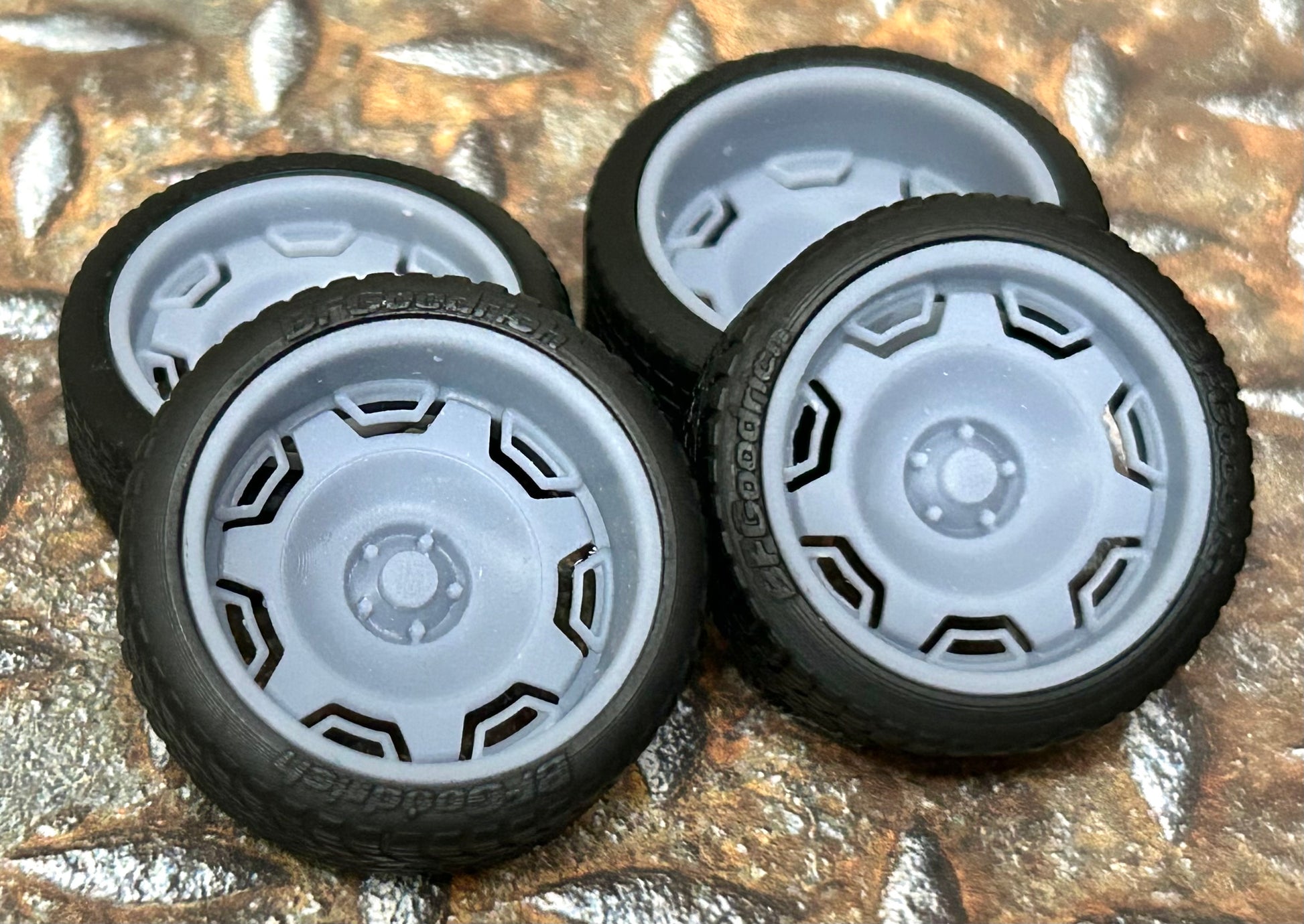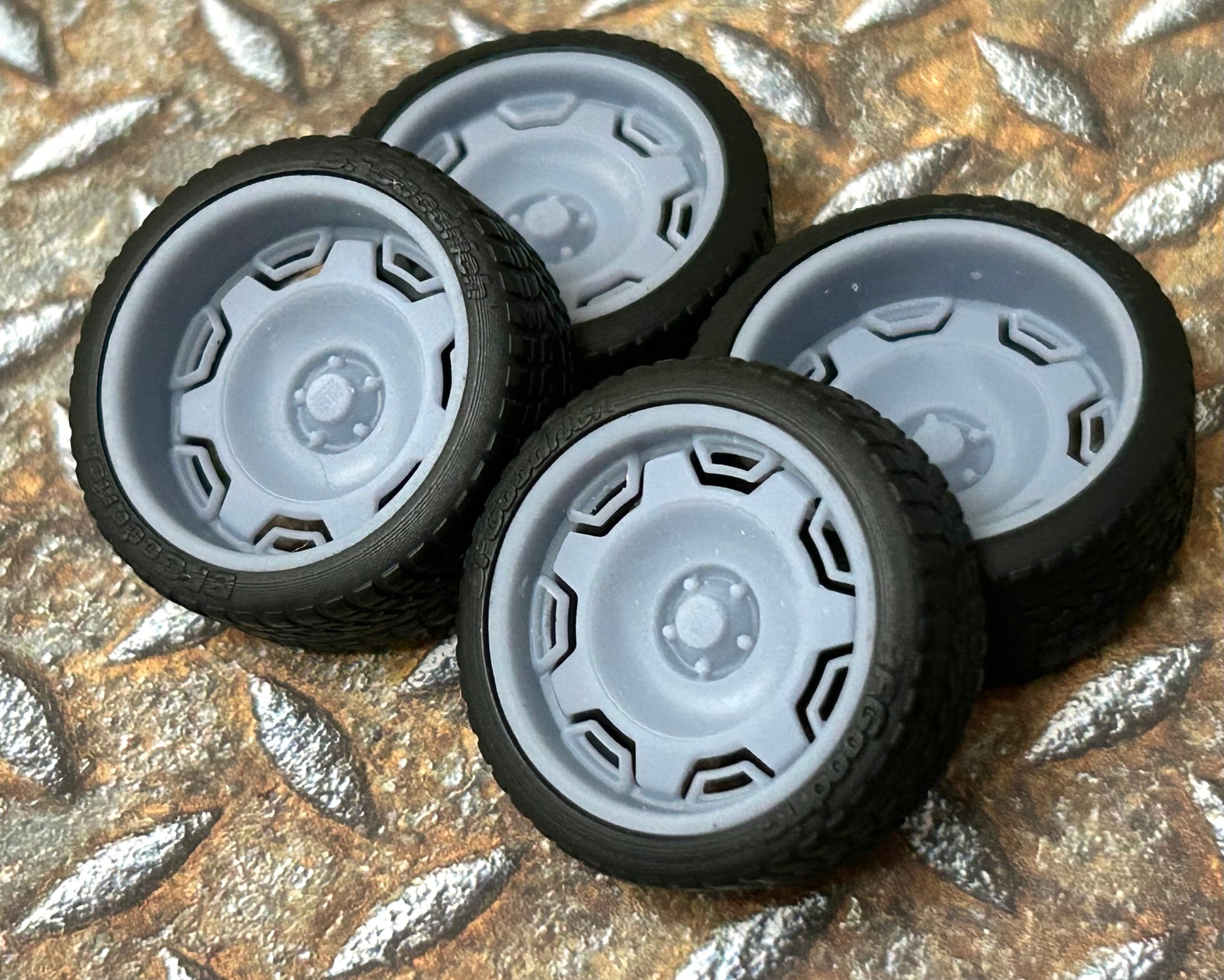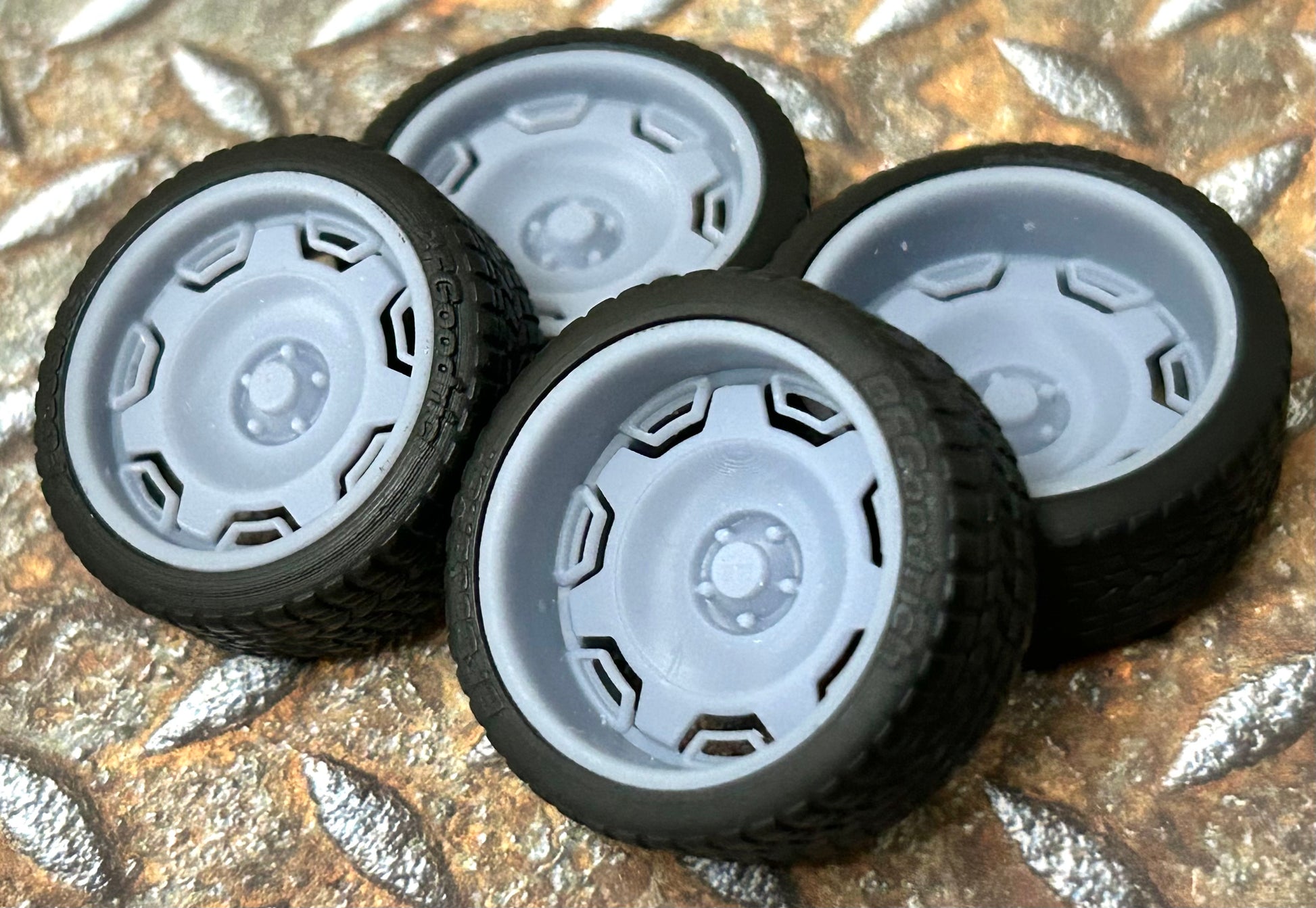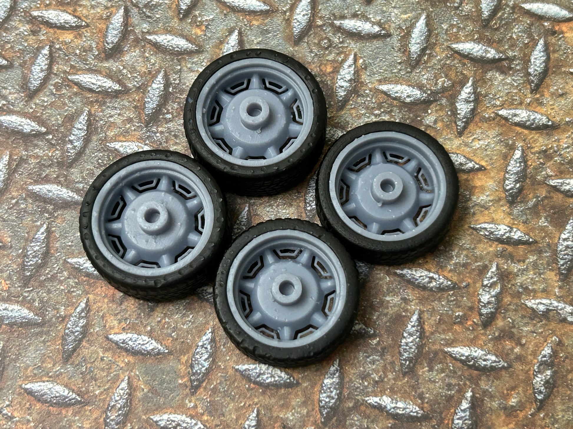 Resin wheels and tires for a 1/24 or 1/25 scale model car.